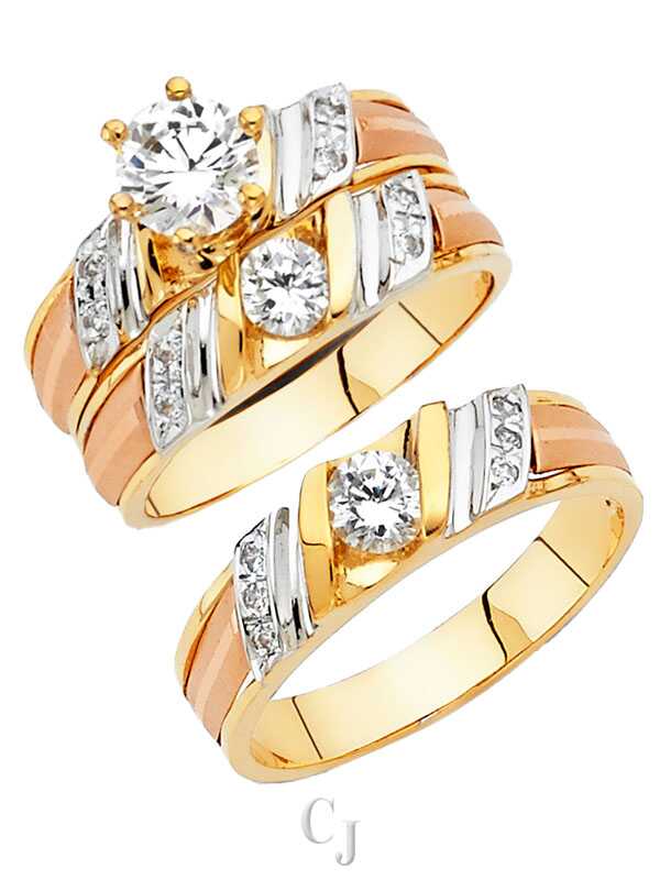Crafted in genuine 14K gold, this CZ Trio Set includes a men’s band, a women’s band, and a sparkling engagement-style ring. Each piece is set with brilliant Cubic Zirconia stones, making it a perfect choice for couples who want elegance and lasting style.