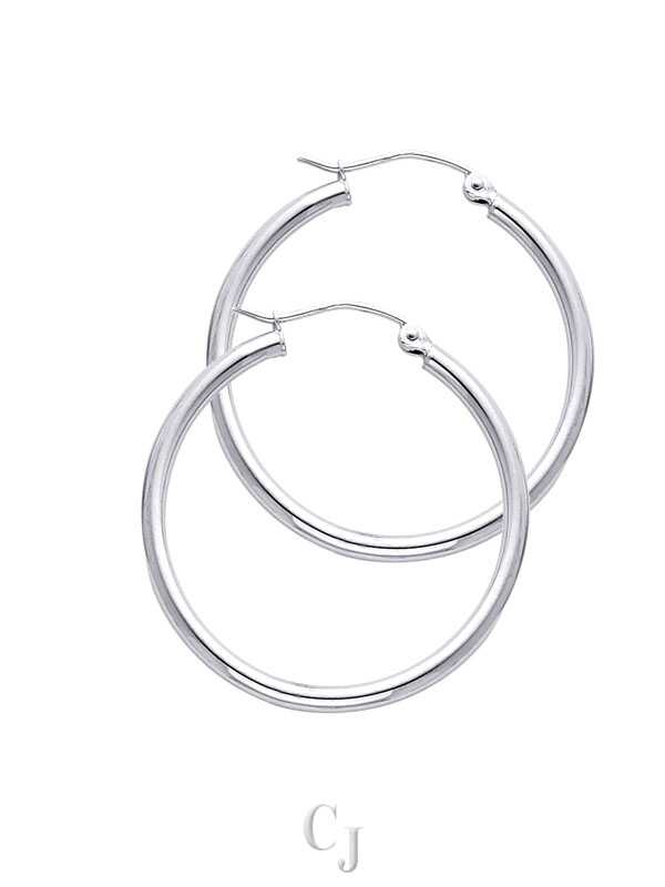 14KW 2mm Round Tube Polished Hoop Earrings (30mm)