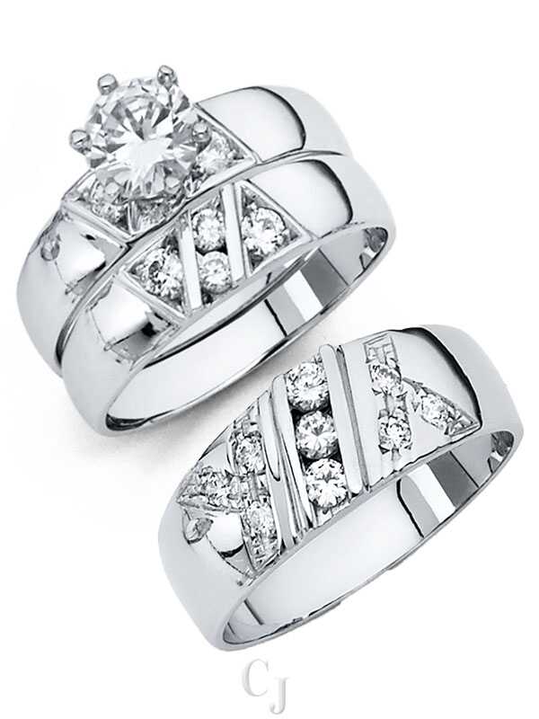 Crafted in genuine 14K gold, this CZ Trio Set includes a men’s band, a women’s band, and a sparkling engagement-style ring. Each piece is set with brilliant Cubic Zirconia stones, making it a perfect choice for couples who want elegance and lasting style.