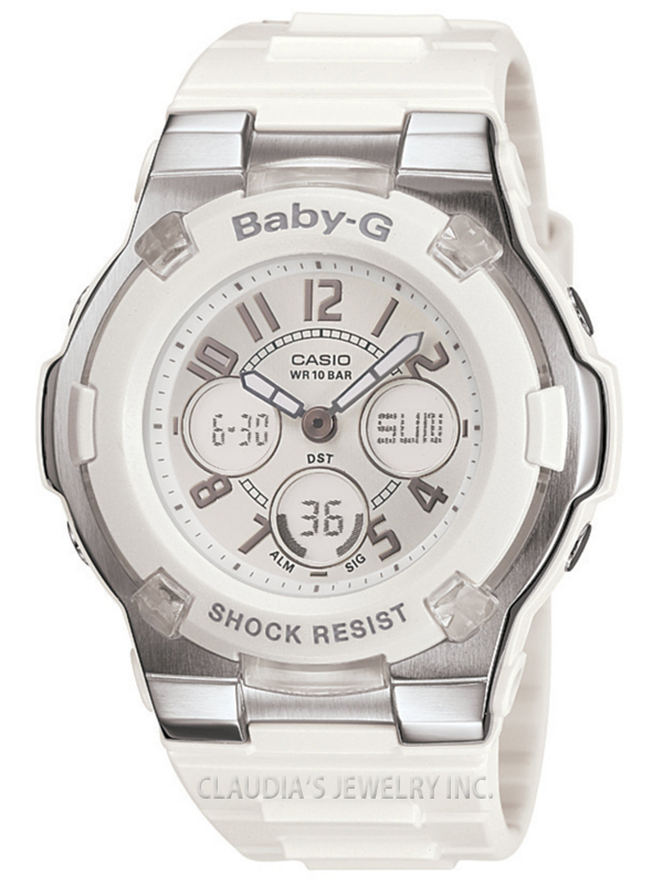 Based on the successful ‘Chaton’ style design of the Slim Marine series, Baby-G introduces four new timepieces with elegant and tough styling. White resin band Analog and digital watch with a white face.