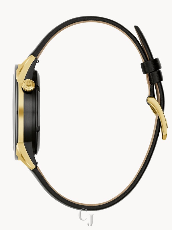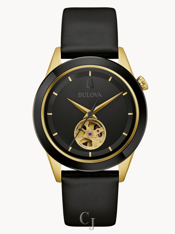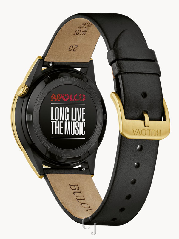 In celebration of fine watchmaking and the spirit of New York City, we present the Bulova x Apollo timepiece inspired by the legendary Apollo Theater—the soul of American culture. This automatic timepiece from our Modern collection blends a sleek modern design with a mechanical heart to ensure you never miss a beat. The 40mm two-tone case features black IP-coated and gold-tone stainless steel and an edge-to-edge metallized crystal, with a black leather strap with a pin-buckle closure. The deep black dial is accented by gold-tone hands and markers and an aperture that reveals the heart of the 21-jewel automatic movement, which has a 42-hour power reserve. Push your style to the edge with this instant classic from Bulova.