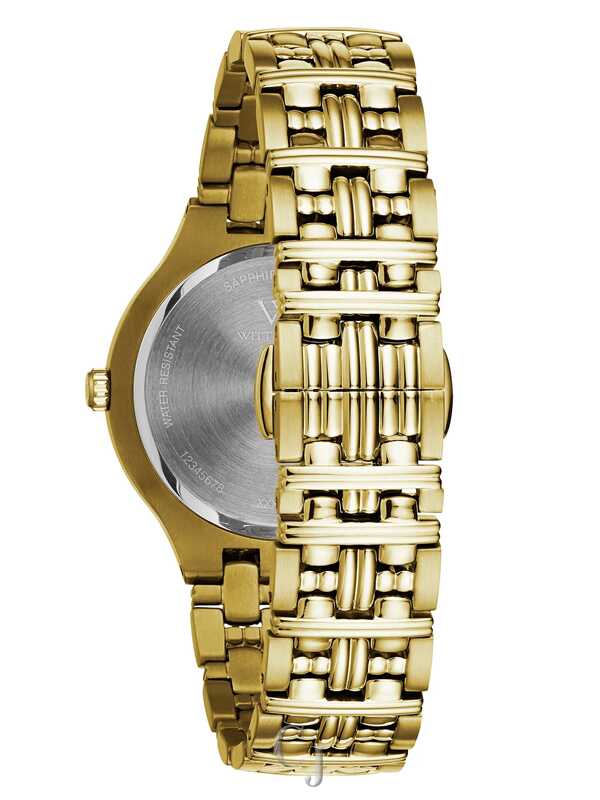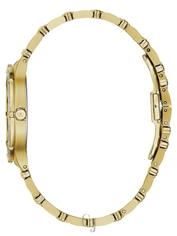 Elegant and refined from every angle in gold-tone stainless steel with 24 individually hand-set diamonds on the bezel. This dazzling timepiece features a multi-link bracelet with brushed and polished finishes for added dimension. Includes a textured silver dial, hand-applied markers, scratch-resistant sapphire glass, double-press deployant closure, and water resistance to 50 meters.