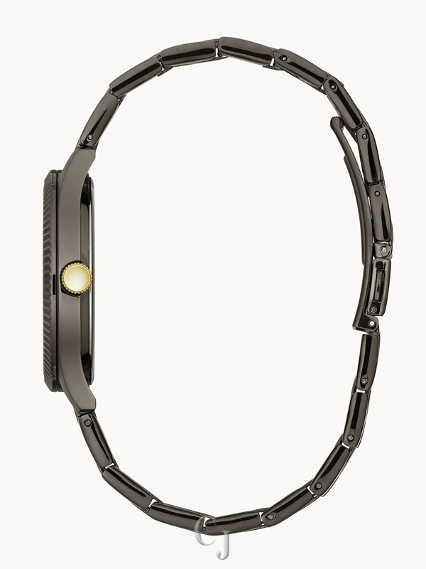 Sleek and streamlined in stainless steel with gunmetal finish, gold-finish crown, grey sun-ray dial, luminous hands, date feature, and double-press fold-over clasp.