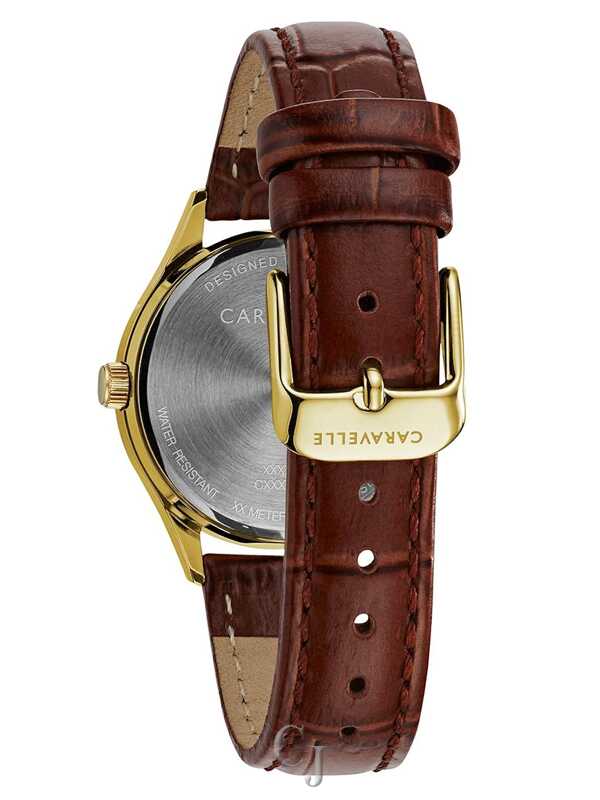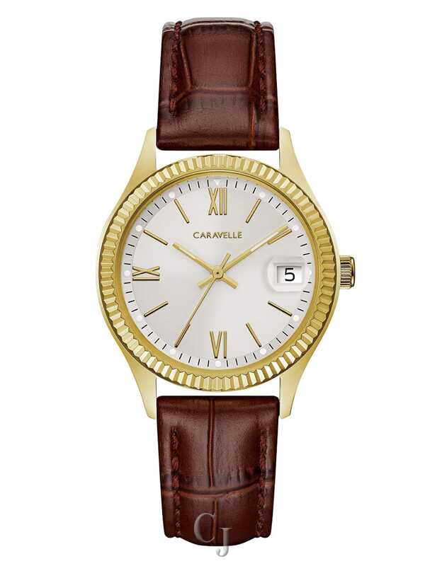 The Caravelle 44M111 presents a sophisticated timepiece for women with a round stainless steel case measuring 32 millimeters in diameter and 8.7 millimeters in thickness. It features a mineral dial window and an analog display, secured with a buckle clasp. The brown leather band, 16 millimeters in width, complements the silver dial and stationary stainless steel bezel. This watch is equipped with a reliable quartz movement and boasts a water resistance of up to 100 feet, making it both stylish and practical for various occasions. It also includes a date function, adding a touch of functionality to its elegant design.