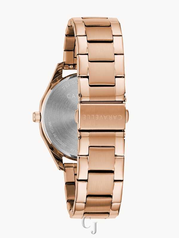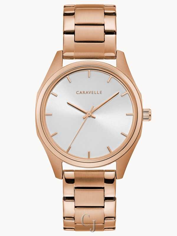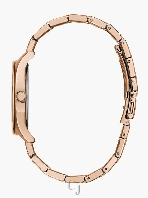 Go for maximum impact with minimalist design. Sleek silver-white sunray dial pops with rose gold-tone hands and dial ring. Rose gold-tone stainless steel case and bracelet with double-push fold-over closure and quick-release spring bar.