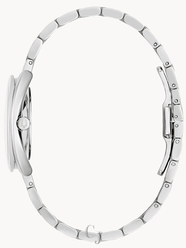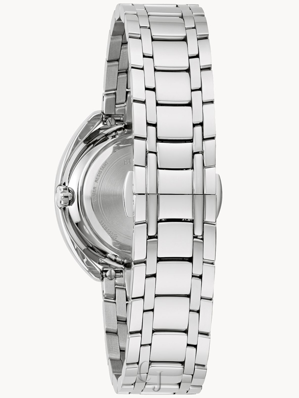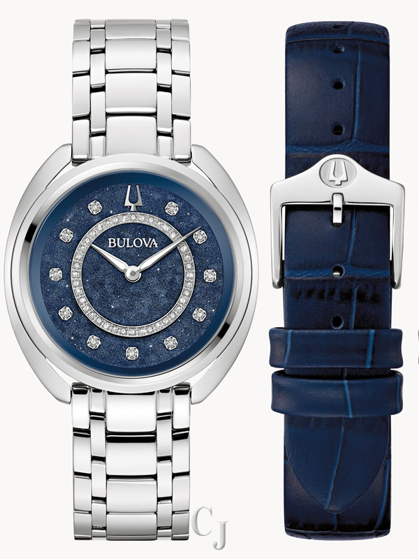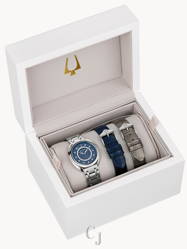 A gorgeous new addition from Bulova, this ladies’ Duality timepiece offers unparalleled elegance and versatility. A round silver-tone stainless steel case features a luxurious blend of brushed and polished finishes, with dramatic curves and a hidden crown. The dial is truly astonishing: a resplendent blue Denchu surface is adorned with 51 hand-set diamonds totaling .13 ctw and fitted with polished hands. The intricate process of making each Denchu dial ensures that no two are alike, allowing a truly unique experience. The Duality is perfectly appointed with a matching silver-tone stainless steel bracelet with a deployant clasp for exceptional comfort. Included in this unique box set are two leather straps, in pewter gray and navy blue, that can be attached with the use of a new easy-release system that is also featured on the bracelet. With a graceful silhouette and a captivating dial, this Bulova women’s timepiece offers timeless refinement no matter the occasion.
