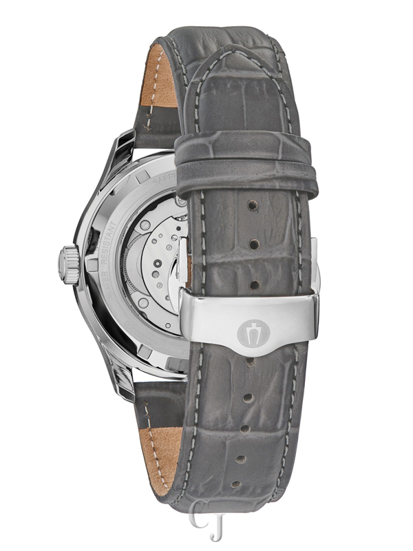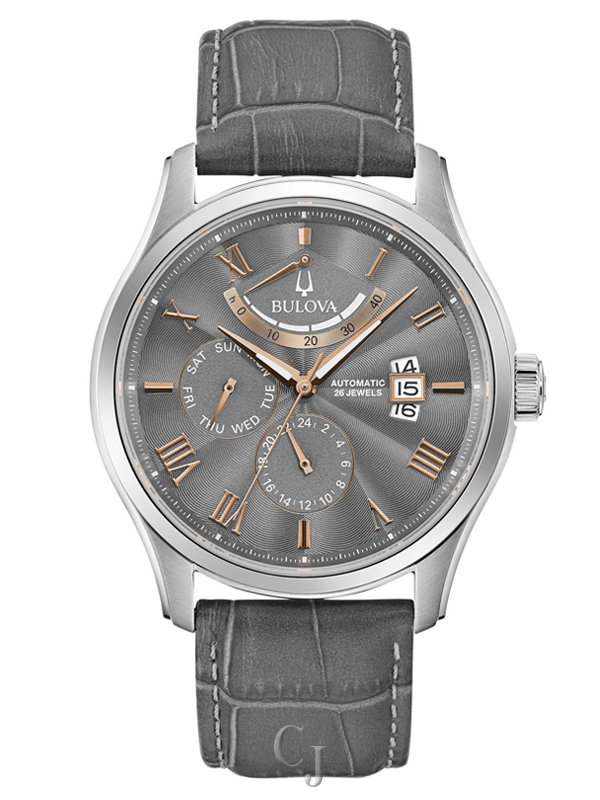 The Bulova Classic Wilton Grey Dial Men’s Watch (Model 96C143) combines elegance and functionality. Its 43mm stainless steel case features a textured grey dial with rose gold-tone Roman numeral markers, luminous hands, and multiple complications: a 40-hour power reserve indicator, date window, 24-hour subdial, and day subdial. A domed sapphire crystal with anti-reflective coating protects the dial, while the exhibition caseback reveals the 26-jewel automatic movement. Finished with a grey alligator-grain leather strap and deployant clasp, this water-resistant timepiece is a sophisticated choice for any occasion.
