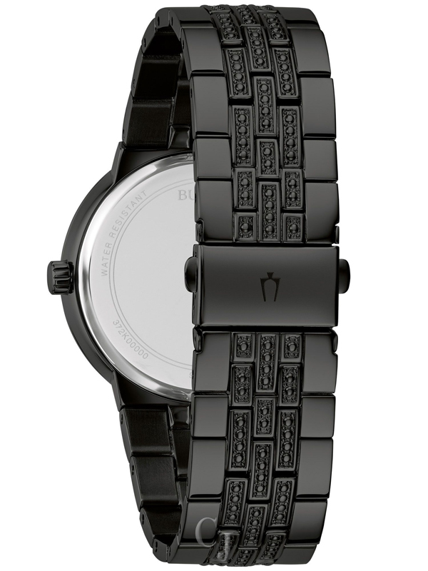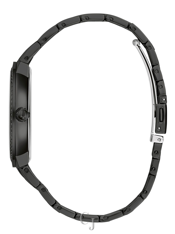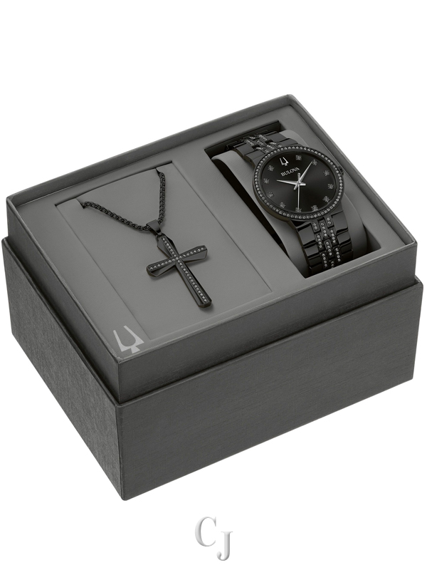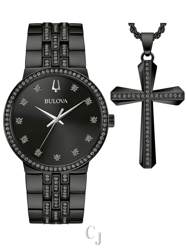 This men’s box set from the Bulova Crystal collection embodies refined elegance. Featuring a sleek black-tone stainless steel case adorned with crystals, it strikes a perfect balance between contemporary and classic design. The striking black dial is embellished with crystal hour markers and black-toned details. The crystals on the bracelet harmonize with the case and dial, and the foldover buckle closure ensures a secure and comfortable fit. Additionally, the set includes a black-tone stainless steel cross pendant encrusted with crystals, adding a touch of sophistication to any ensemble. This meticulously crafted set offers a stylish timepiece suitable for any occasion.