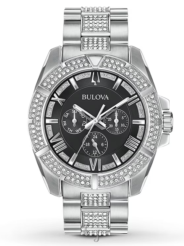 The Bulova Crystals Black Dial Men’s Watch (Model 96C126) combines elegance and functionality. Its 44mm stainless steel case features sparkling crystals on the bezel, dial, and bracelet. The black dial includes luminous hands, markers, day and date displays, and a 24-hour subdial. Powered by quartz movement and protected by a mineral crystal, it is water-resistant to 30 meters and secured with a stainless steel bracelet and deployment buckle clasp, making it a stylish choice for any occasion.