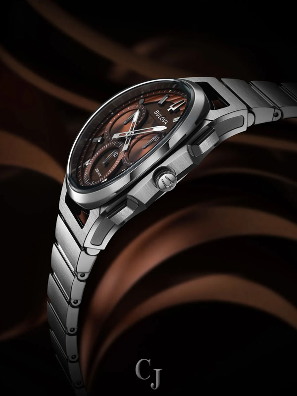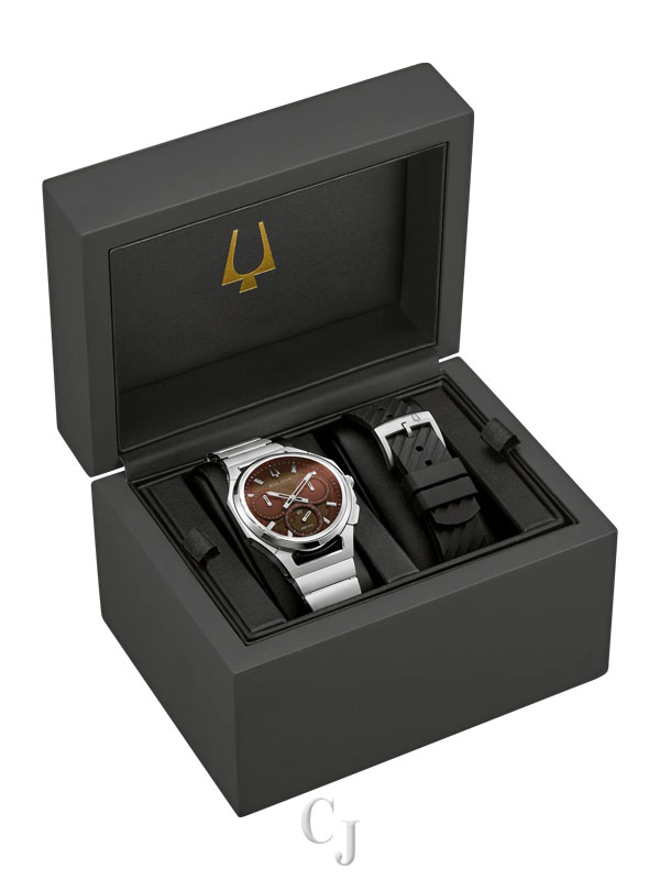 Bulova’s most daring collection gets an upgrade with the latest men’s CURV chronograph watch. Featuring the world’s first curved chronograph movement vibrating at 262kHz for exceptional accuracy, the CURV’s bold modern case is reimagined in a 41mm diameter and now features an interchangeable strap system enabling quick changes from its matching bracelet to a black rubber strap. Technically and aesthetically audacious, the CURV’s 5-hand chronograph layout is displayed against a translucent brown dial revealing the complex movement beneath. Partially skeletonized hands and applied indices receive luminous paint for utility in every environment. With new versatility that heightens its exceptional look and feel, the Bulova men’s CURV chronograph delivers cutting-edge technology and style.