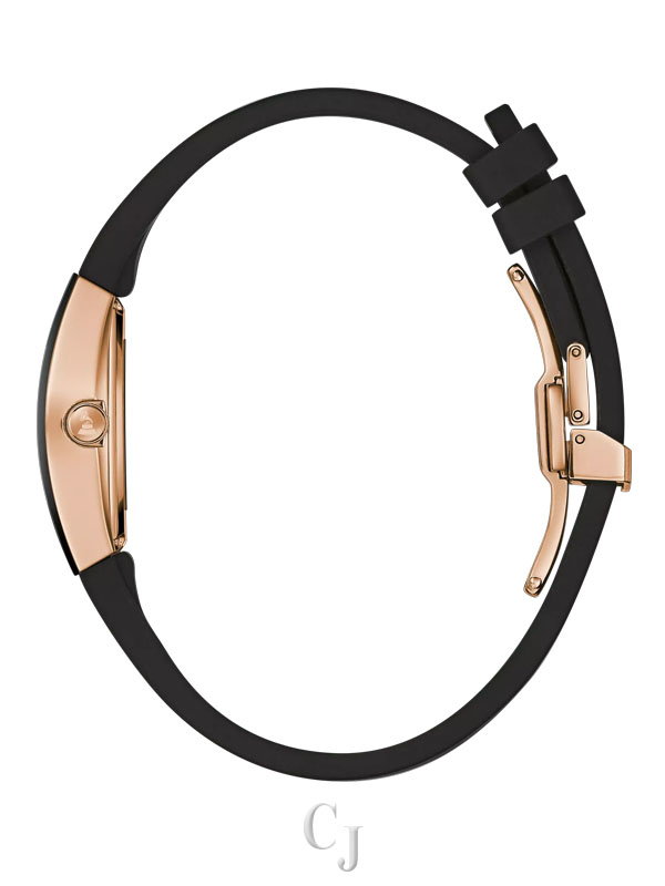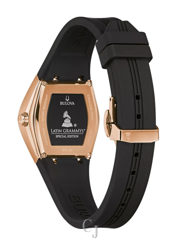 As the official Timepiece partner of The Latin GRAMMYs®, Bulova has created the Latin GRAMMY® Gemini, a new curved tonneau design. The distinctive asymmetrical rose gold-tone stainless steel case with a black signature Futuro edge to edge curved metalized crystal features a black dial with rose gold-tone accents. The black silicone strap features the iconic Latin GRAMMY® logo on the front, as well as on the case back which showcases the platinum colored logo to commemorate the 21st Annual Latin GRAMMY® Awards. The watch features a three-hand quartz movement, deployant buckle with pushers, and water resistance to 30 meters.