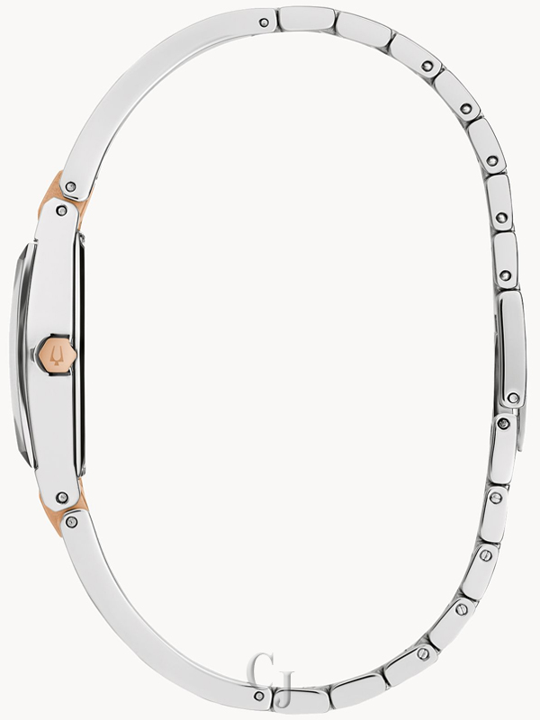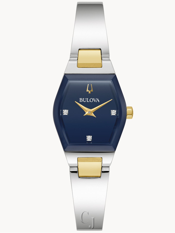 Exceptionally modern and uniquely refined, this distinctive women’s timepiece from the Bulova Gemini Collection is designed to make a statement. The silver- and gold-tone case features a sleek edge-to-edge faceted metalized mineral crystal in blue, creating rich depth that is mirrored in the deep blue dial. Featuring gold-tone accents with beveled hands and three hand-set .8mm diamonds, the watch is perfectly paired with a bangle-style silver- and gold-tone bracelet with a jeweler’s clasp closure. A strikingly sophisticated take on contemporary design, this Bulova women’s timepiece will elevate any ensemble.