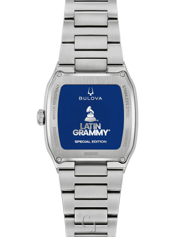 Bulova continues its long-running partnership with the Latin GRAMMY with a stunning new time piece that channels the spirit of Latin music. Unapologetically modern, the latest Latin GRAMMY captures the brightness of Latin music with a fully polished case with an edge-to-edge crystal, giving it a contemporary look. The dial is as textured as any song, with a brushed silver-white surface laying the backbeat for bright blue hands and accents. On the reverse, a caseback insert carries the same rich blue hue, with text and artwork commemorating the Latin GRAMMY. Paired with a dual finished H-link bracelet, this Bulova timepiece beautifully celebrates the Latin GRAMMY and its music.