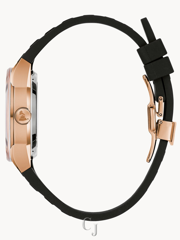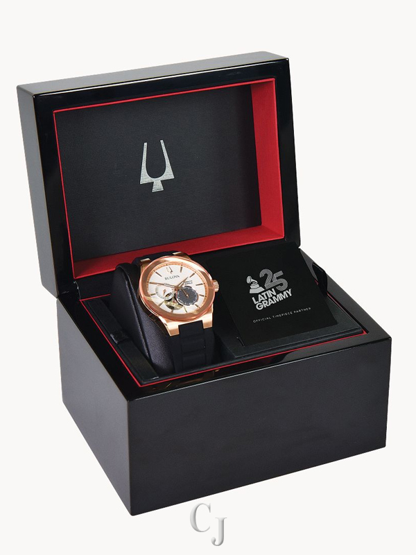 As the official Timepiece partner of The Latin GRAMMY®, Bulova has built upon the Latin GRAMMY® Automatic watch, incorporating musical cues in its design in a slimmed down 38mm case. The distinct timepiece features an open heartbeat aperture and an exhibition case back, showcasing the fine 21-jewel automatic movement with a 42-hour power reserve. The rose gold-tone stainless steel case features a silver-white dial with a black-gray subdial, both of which are textured to resemble the guiro instrument, with guiro scraper-shaped markers designating the hours. The case back is further enhanced with a glass insert customized with the Latin GRAMMY® 25th Anniversary logo. The watch is paired with a fitted black silicone strap that meets the case to create a seamless silhouette on the wrist. Together with the Latin Recording Academy, Bulova once again celebrates the diverse beauty of Latin music with the Latin Automatic watch.