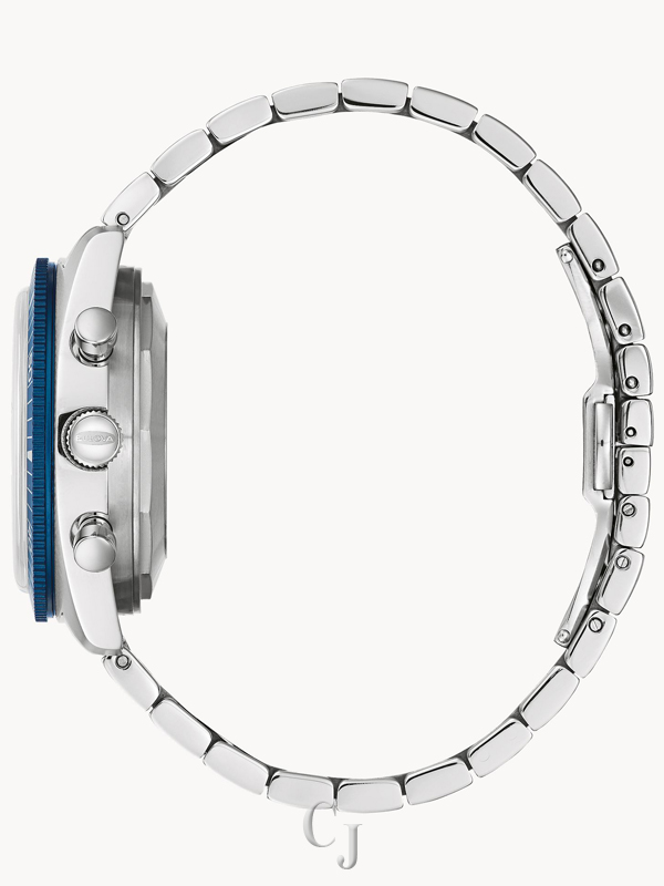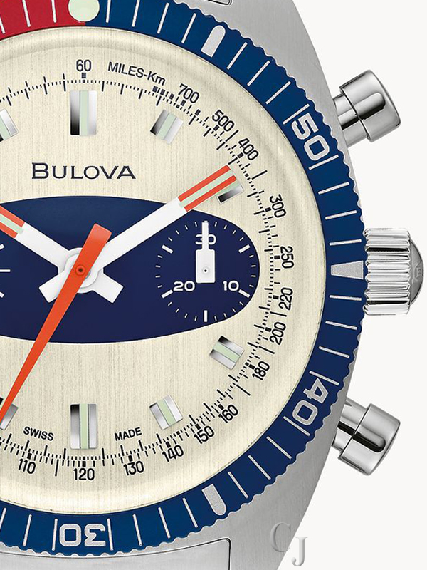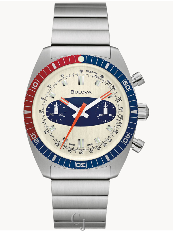 Now available to shop! A style inspired by history, the Limited-Edition to 350 pieces. Chronograph A is a nod to the popular Bulova diver chronographs from the 1970s that were nicknamed the “Surfboard” for the distinctive blue oval shape encircling the two sub dials. This updated version features a stainless-steel case with blue and red accents and an off-white dial, the notable blue surfboard oval, orange-tipped hour and minute hands, luminous hands and markers
