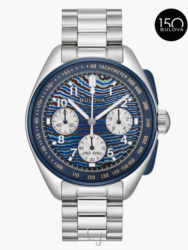 In collaboration with famed Brazilian artist Thiago Rosinhole, Bulova’s legendary Lunar Pilot chronograph is revisited for Bulova’s 150th Anniversary, combining Bulova’s legacy of precision timing with Rosinhole’s unique style of fusing street art and pop culture for this new limited-edition Lunar Pilot timepiece. Beneath the flat sapphire crystal, the watch takes a striking turn with a mesmerizing Timascus dial, crafted from titanium that has been folded through the Damascus process to achieve its captivating pattern. Slim, blue chronograph pushers and a crown featuring the Bulova tuning fork accent the 43.5mm silver-tone stainless steel case, while six-hand chronograph functionality with timing to 1/20th second, silver registers, and Super-Luminova applied to the hands and markers complement the dial’s blue tachymeter ring. Powered by our proprietary high-precision quartz movement, resonating at a frequency of 262khz for unparalleled accuracy and allowing a sweeping chronograph hand , the watch is paired with a matching 3-link silver-tone stainless steel bracelet and features an individually numbered case back embossed with Rosinhole’s signature Budii figure. A modern interpretation of a historic timepiece with a unique twist, the Bulova Lunar Pilot is the ideal watch for today’s explorer and is presented in special packaging, including a storybook and a signature 6-inch Budii figurine designed by the celebrated artist, exclusively for this collaboration. Limited to 5,500 pieces worldwide.
