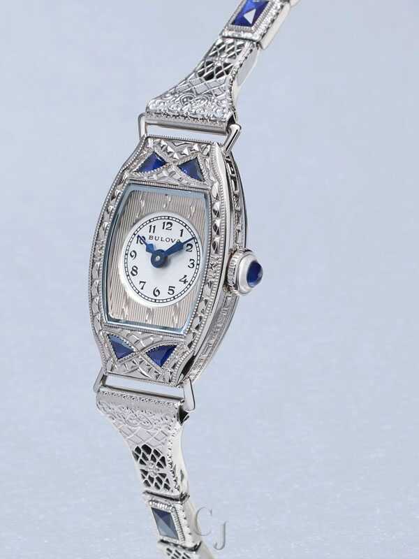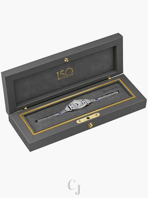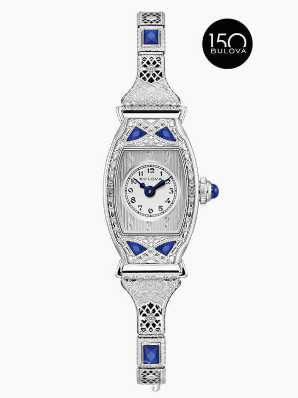 Celebrating the infinite glamour of the Art Deco era, this Bulova limited-edition ladies’ watch honors Bulova’s 150th anniversary. The Bulova Miss America collection was one of the most iconic in our history – spanning four decades and embodying femininity. Inspired by the original from 1930, this new luxurious timepiece has a slender silver-tone stainless steel case set with six deep blue synthetic sapphires and an ornately filigreed expansion bracelet with a seamless buckle closure. The refined silver-tone dial features vintage-inspired blue hands and a brushed surface under the watch’s domed sapphire crystal. The case back is engraved with the 150th Anniversary logo and is individually numbered to mark each limited-edition piece. Pay tribute to Bulova’s vibrant history with this incomparable ladies’ timepiece. Presented in a luxurious custom case complete with a storybook honoring our Art Deco heritage. Limited to 600 pieces worldwide.