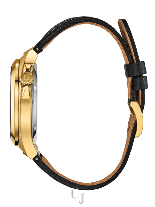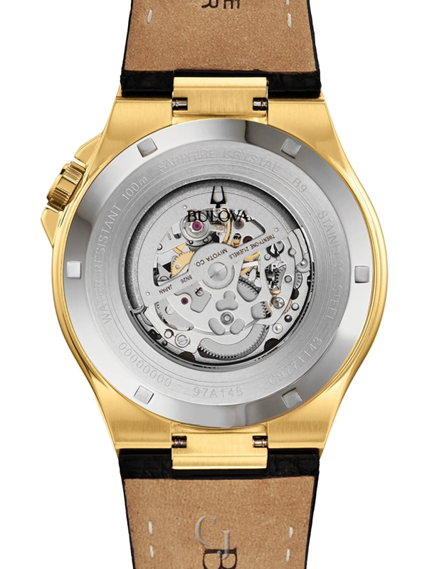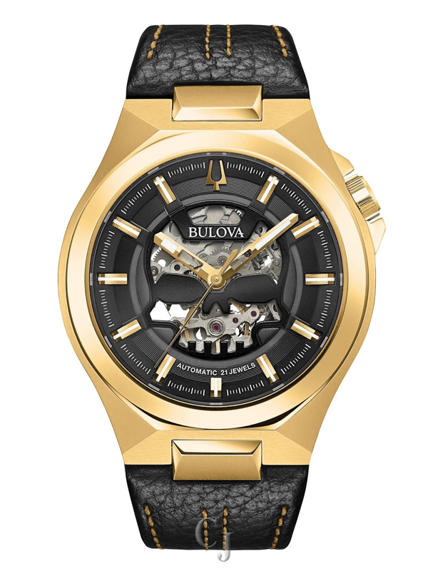 The Bulova Maquina Automatic Black Dial Men’s Watch (Model 97A148) features a 46mm yellow gold-tone stainless steel case with a skull-shaped open aperture on the black dial, luminous yellow gold-tone hands, and markers. Powered by a 21-jewel automatic movement with a 42-hour power reserve, it includes an exhibition case back and sapphire crystal. Water-resistant to 100 meters, it is finished with a black leather strap and buckle closure for bold style and comfort.
