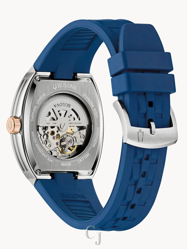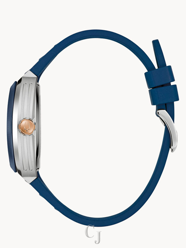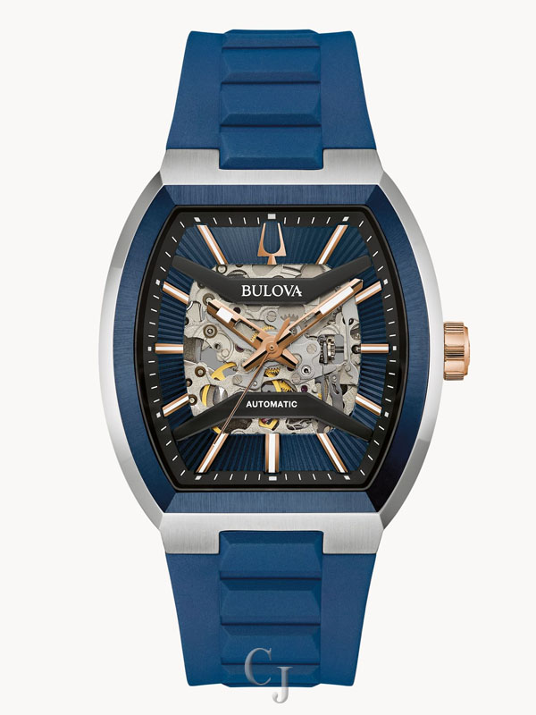 This Bulova men’s watch from the Maquina collection offers daringly avant-garde design. The watch features a 40mm rose gold- and silver-tone tonneau-shaped stainless steel case with a double-curved sapphire crystal, a blue bezel, and a blue HNBR rubber strap with a pin-buckle closure (move further down). The blue patterned dial with black dial ring and bridges has rose-gold tone hands and markers with luminescent fill and a central aperture revealing the inner workings of the 21-jewel automatic skeletonized movement, also visible through a transparent case back, which has a 42-hour power reserve. With its mechanical heart and unrivaled modern form, this Bulova men’s timepiece offers a uniquely bold individual expression of style.