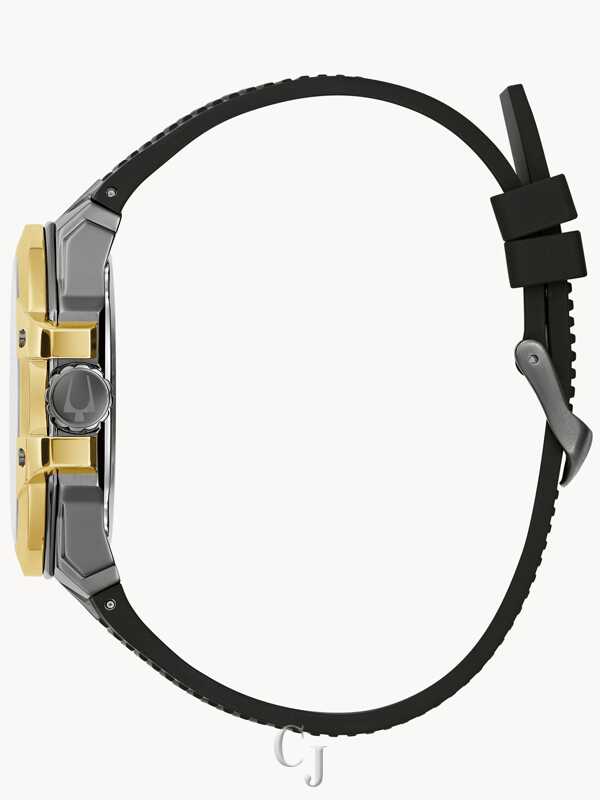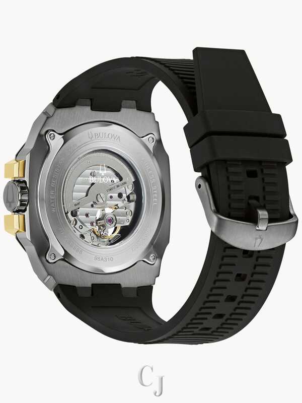 The Bulova men’s Maquina collection gets the Marc Anthony treatment, with the iconic performer adding his personal touch to the modern design. A boldly distinct stainless steel case features gray and gold-tone IP plating with a daringly faceted silhouette. The multilayered gray dial features luminescent paint on its markers and its skeletonized hands, with gold-tone accents around a 24-hour subdial and a running seconds subdial. The translucent center dial and its aperture offer a glimpse at the timepiece’s beating heart: an automatic 21-jewel movement with a power reserve of 42 hours. The watch is paired with a rugged silicone strap with a secure 3-piece buckle closure. Combining Marc Anthony’s stylish edge with Bulova’s precision, this new Bulova men’s Maquina timepiece is the perfect companion for those who want to make a statement.