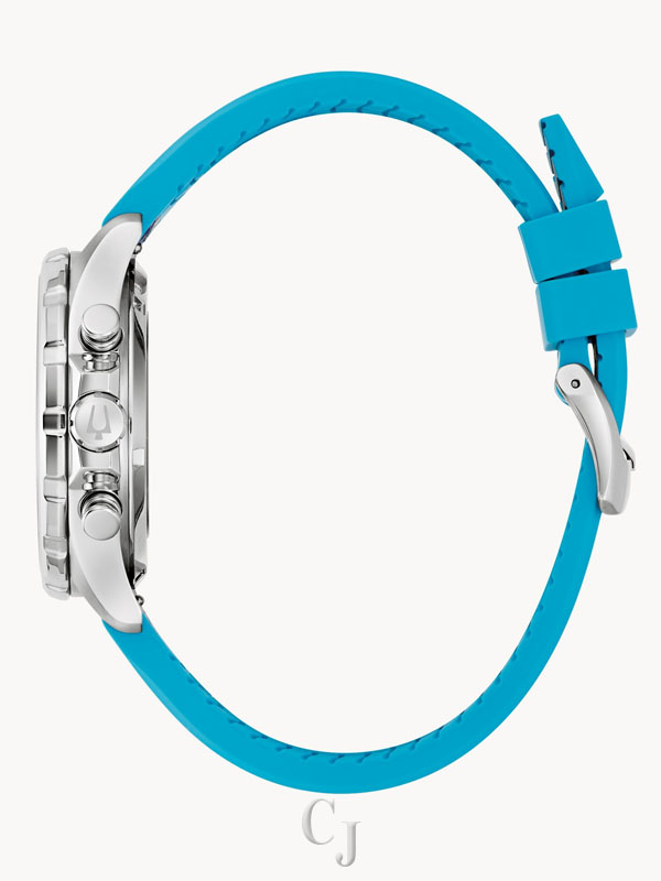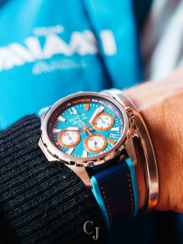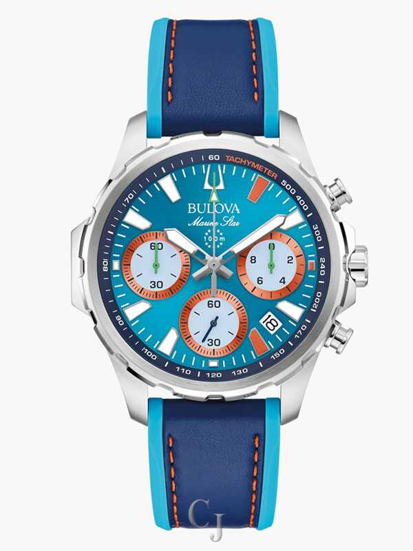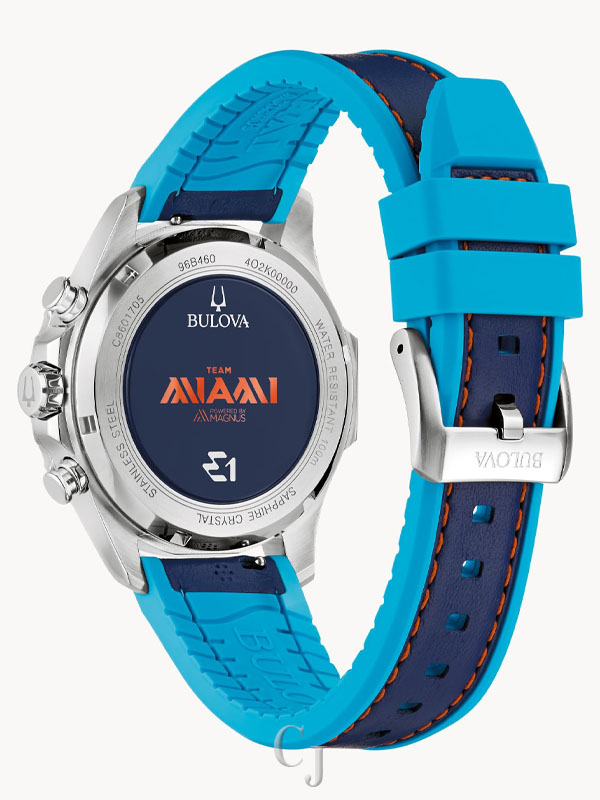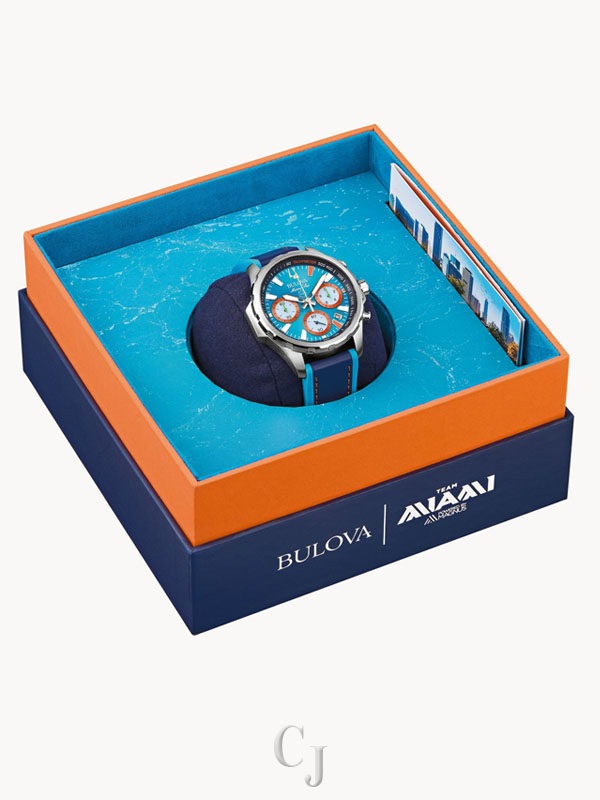 Ushering in a new era of electric boat racing, the Team Miami E1 Racing Marine Star B commemorates E1’s Team Miami and the E1 Championship. The striking timepiece designed in the Team Miami E1 colors features a silver-tone stainless steel case with a flat sapphire crystal with anti-reflective coating and 100m of water resistance, a custom logo case back, and a leather and silicone rubber strap that coordinates with the dial. The blue dial has silver-tone applied markers and hands with Super-LumiNova luminescent fill, bright green accents, a date display, and orange and silver-tone subdials, including registers allowing timing to 1/20 of a second. As the official timekeeping partner of E1 Team Miami, Bulova presents this special edition timepiece in its custom designed box inspired by this exhilarating new frontier of speed.