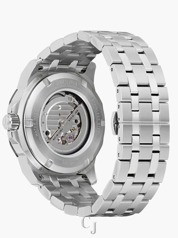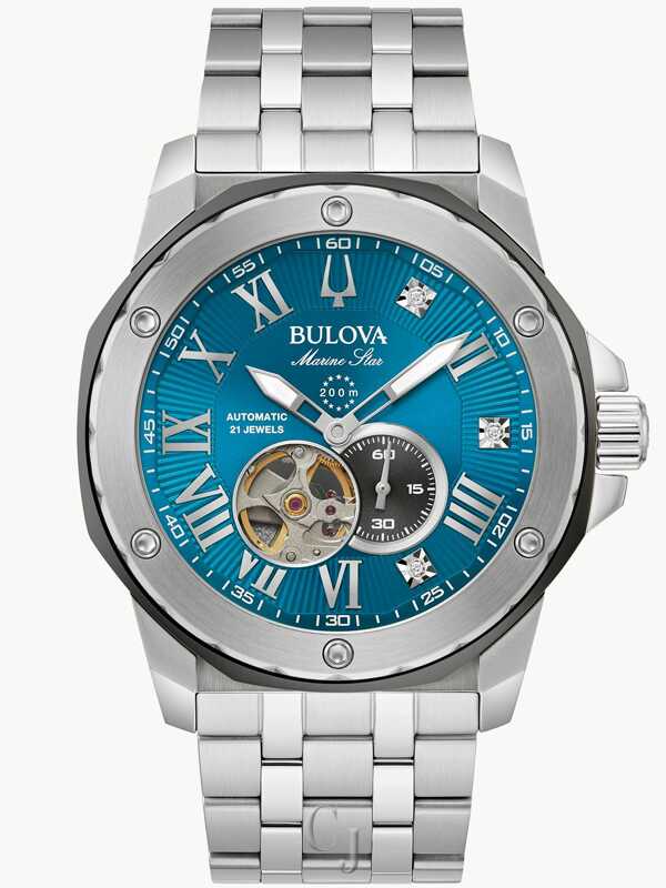 Capturing the daring style of Marc Anthony, one of music’s most influential artists, Bulova presents the all-new Marc Anthony Series A. The bold, angular silver-tone stainless steel case features brushed finishing with polished accents, a silver-tone bezel with grey accents, a flat mineral crystal, and a screw-down crown. The stunningly vibrant blue dial combines sunray texture along the hour track and a central dial with a radiant sunburst finish, complete with hands with luminescent treatment, polished indices, and a grey running seconds sub-dial. The dial is further accented with diamond hour markers at 1, 3, and 5 o’clock, chosen by Marc for their personal significance. Visible through both the dial aperture and an exhibition case back, the open heartbeat automatic movement features 21 jewels and a 42-hour power reserve. The 44mm watch has 200m of water resistance and is complemented with a matching silver-tone stainless steel bracelet with a push-button deployant clasp. Uniting Marc Anthony’s iconic music with Bulova’s proprietary technology and Bold at Heart spirit, this new men’s timepiece will keep you always within style’s rhythm.