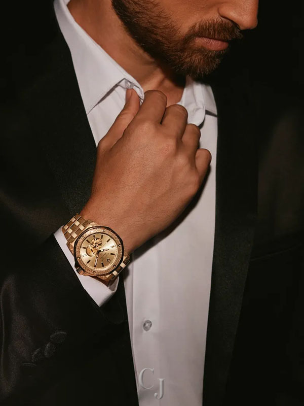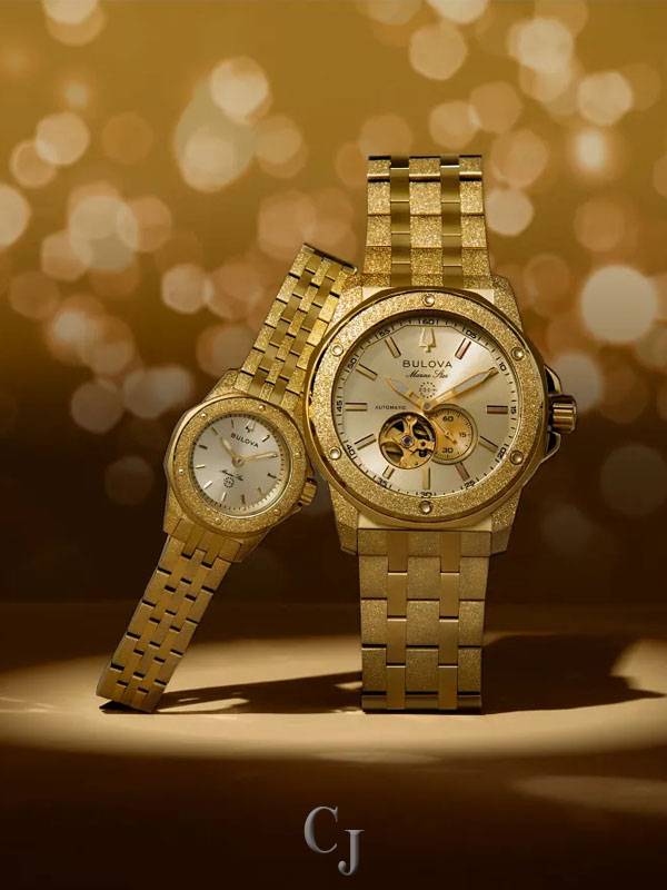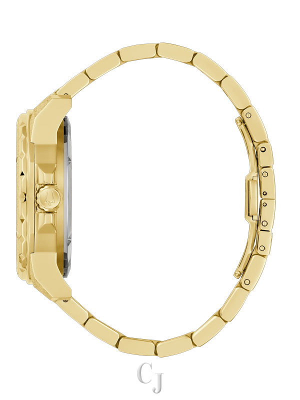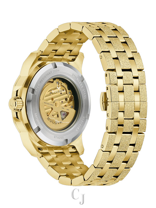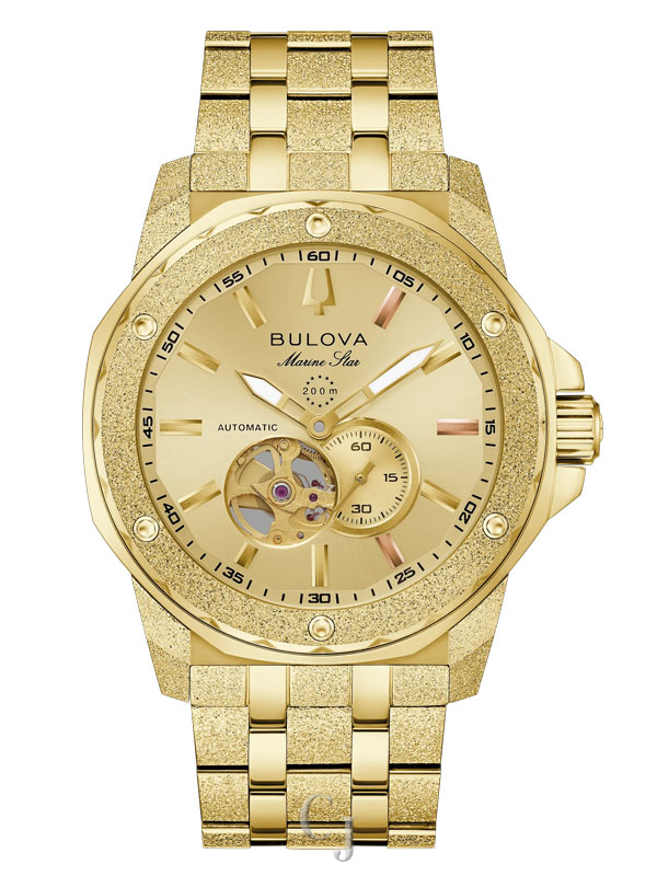 Combining classic nautical styling with contemporary flair, this Bulova Marine Star men’s watch captures a legacy that reaches back decades and captures the incredible spirit of legendary musician Marc Anthony. Bold and angular, the gold-tone stainless steel case is defined by textured iced finishing with polished accents and a gold-tone bezel. Elevating the timepiece’s luxurious aesthetic, a radiant gold-tone dial features matching hands and hour markers, each with luminescent material, with rose gold-tone accents at 1, 3, and 5, numbers with personal significance to Marc Anthony. Visible through both a dial aperture and a smoked exhibition caseback with Anthony’s signature, the open heartbeat automatic movement features 21 jewels and a 42-hour power reserve. Completed with a matching gold-tone stainless steel bracelet with a push-button clasp and delivering 200 meters of water resistance, this new Bulova Marine Star from the Marc Anthony collection is equipped to handle the rhythms of a life well lived.