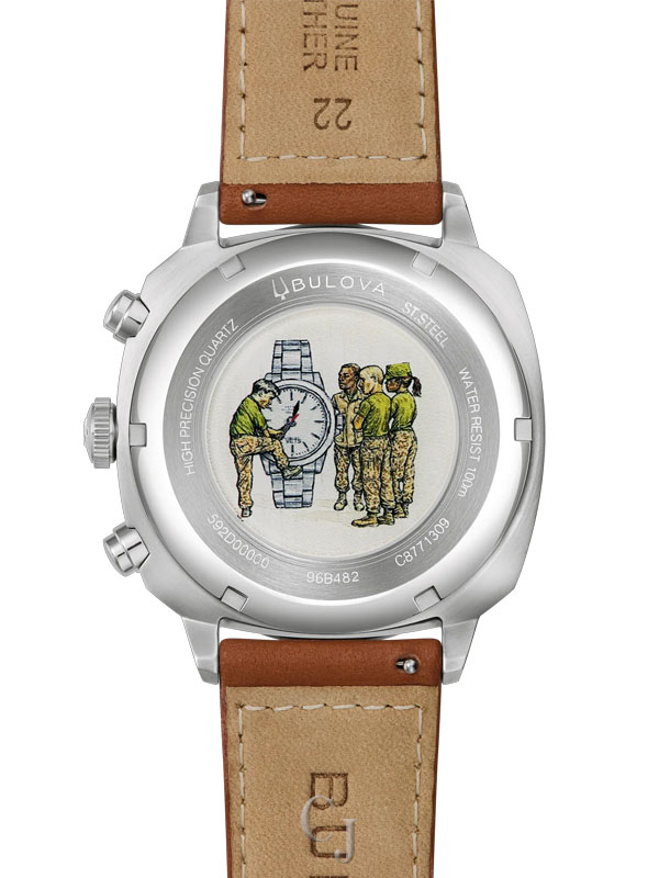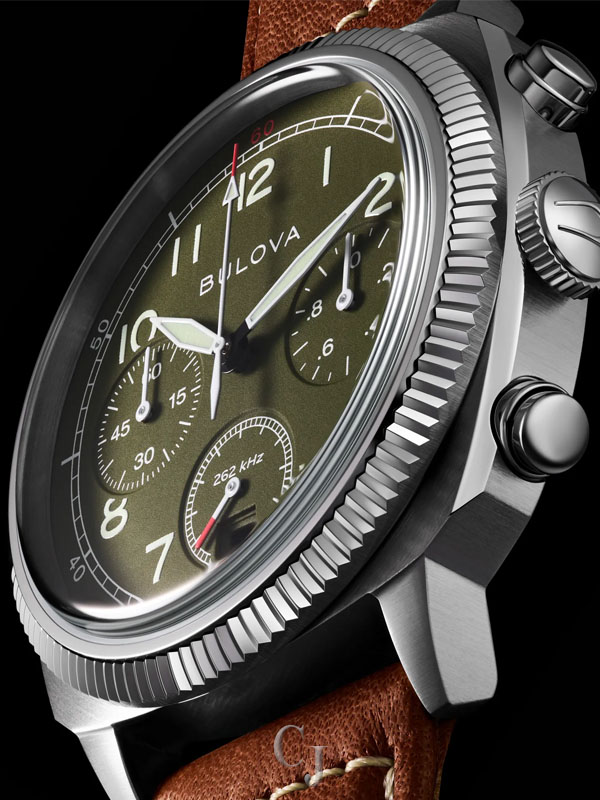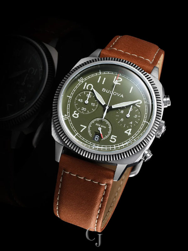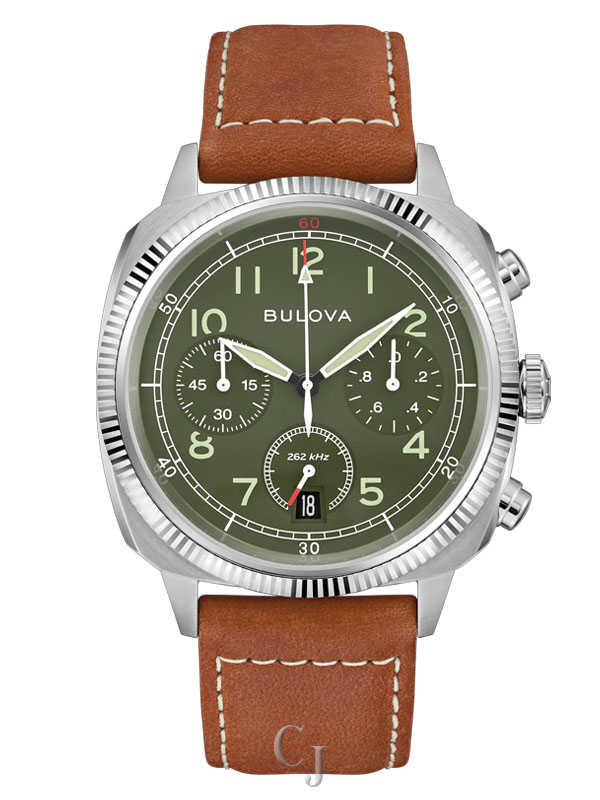 Bulova’s latest military-inspired timepiece is a revamped style from the past. Defined by it’s stainless steel cushion case and coin-edge bezel, this 6-hand chronograph watch affords functionality and iconic heritage style. The military green dial is appointed with three…subdials and a date, with beige accents to create contrast and capture classic military hues. The watch is powered by the brand’s proprietary high precision quartz movement, a revolutionary mechanism vibrating at a remarkable 262kHz, accurate to seconds per year with increased resistance to temperature changes, and with a sweeping chronograph seconds hand. Partnering with the Veteran Watchmaker’s Initiative, 10% of every sale will go help provide employment opportunities in watchmaking for U.S. military veterans. For accuracy, style, and to support an exceptional cause, this Bulova men’s watch can’t be beat.