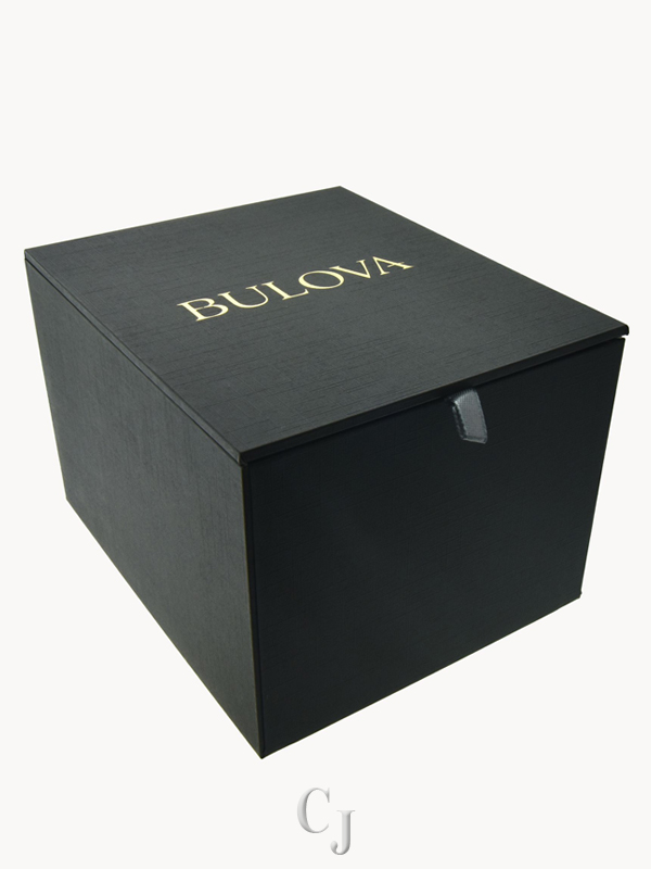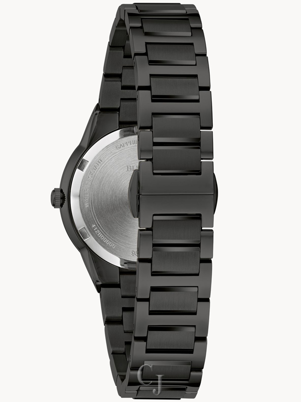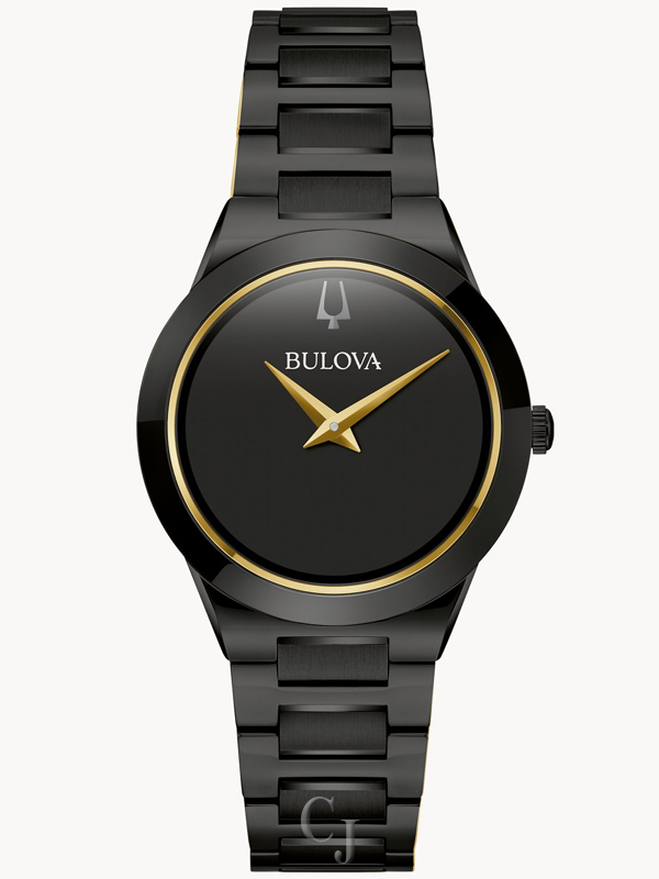 A masterclass in modern design, this sophisticated timepiece from the Bulova ladies’ Modern collection will add a contemporary edge to your style playbook. The black IP stainless steel case design features a metalized domed edge-to-edge sapphire crystal that extends to form the black bezel of the timepiece, while a sleek silhouette flows seamlessly into a matching black IP stainless steel bracelet with brushed center links and a push-button deployant closure for a sleek profile. A gold-tone case ring encircles the dramatic black dial, which pushes the limits of minimalism with no markers and angular gold-tone hands. An uncompromising commitment to modern design, this Bulova ladies’ timepiece will push any wardrobe beyond convention.