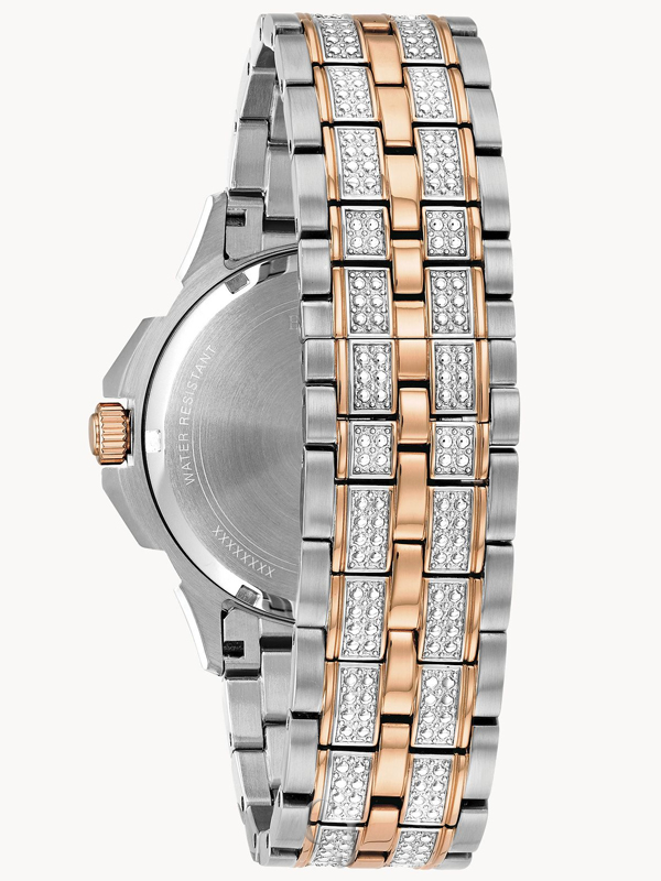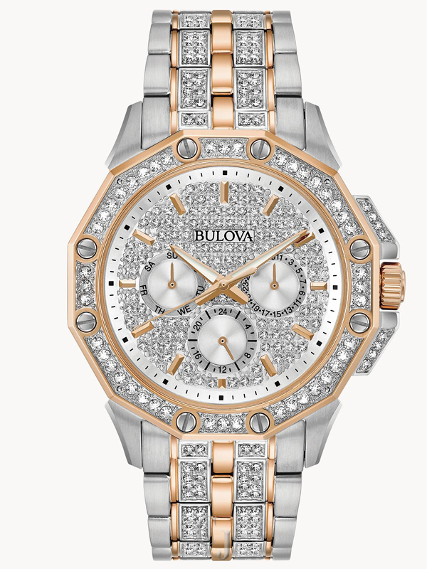 Multi-function dress watch boldly embellished with 300 crystals on the two tone silver and rose gold-tone stainless steel case and bracelet with a pave set silver white dial. Water resistance to 30 meters.