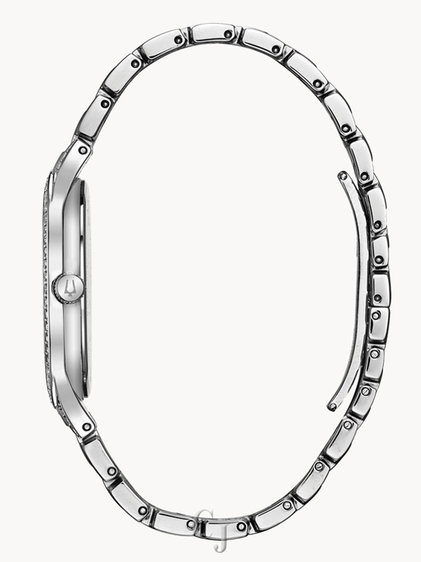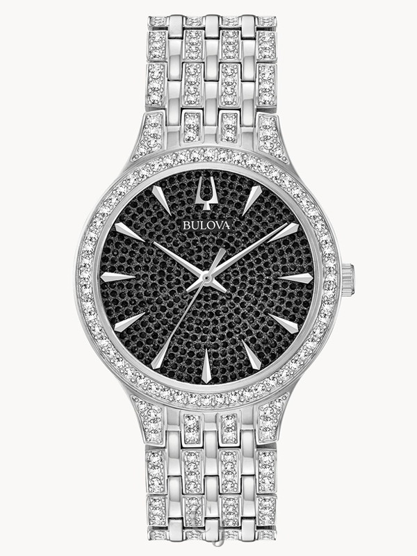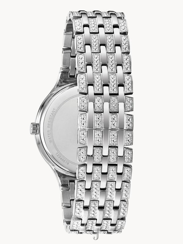 New slim and sleek style embellished with 636 crystals. Silver tone stainless steel case and bracelet and black pave dial. Watch features a flat mineral crystal, quartz movement, and water resistance to 30 meters.