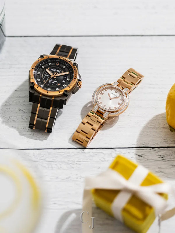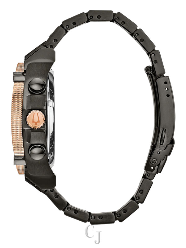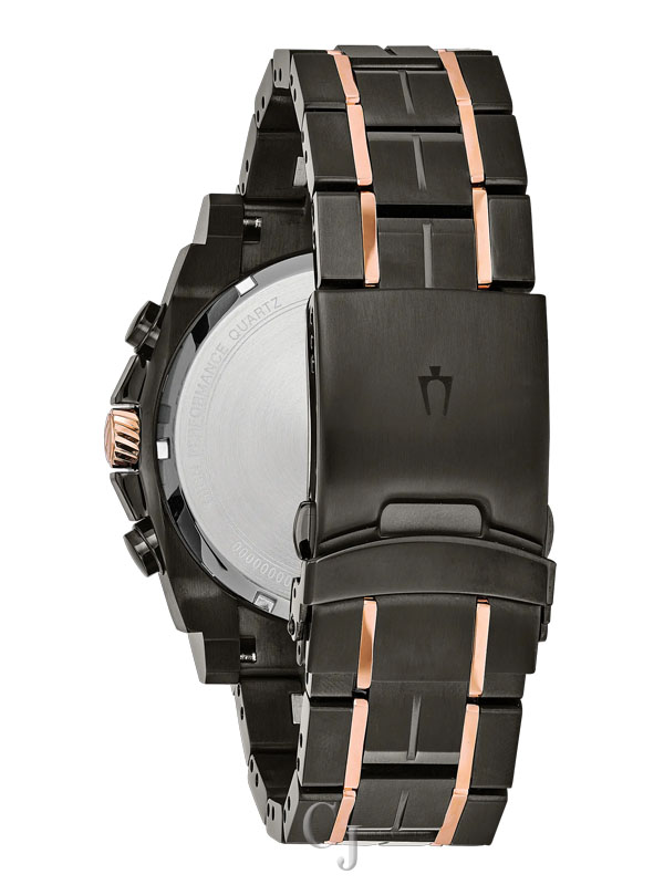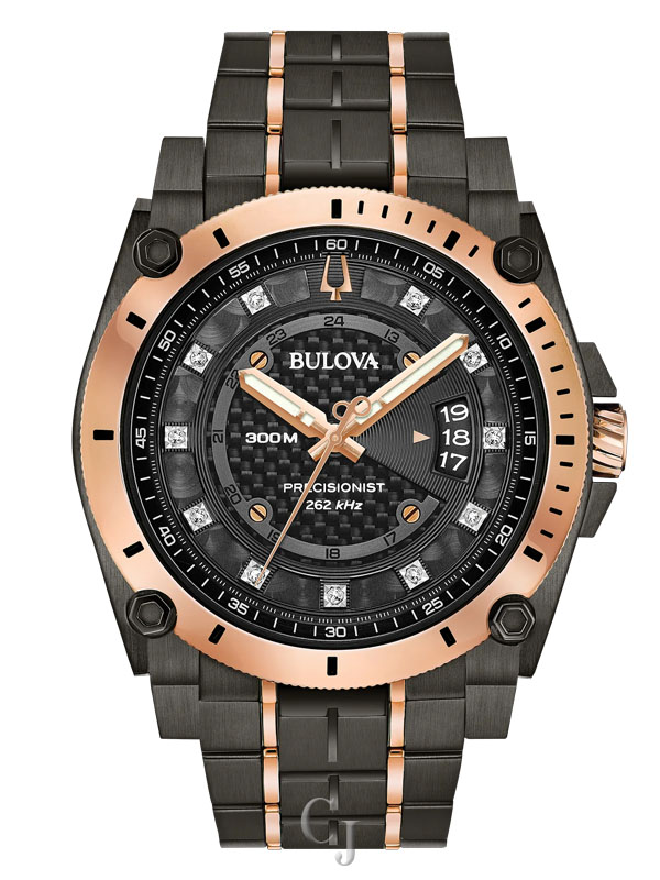 From the Icon Collection with precise timing to 1/1000th of a second and continuous-sweep second hand. Luxury timepiece style in grey IP stainless steel with rose gold-tone accents on case and bracelet, 11 diamonds individually hand set on two-tone black/grey dial with calendar feature, curved mineral glass, screw-back case, fold-over buckle closure with safety lock and extender, and water resistance to 300 meters. Powered by Bulovas proprietary three-prong quartz crystal Precisionist movement with a 262kHz vibrational frequency–eight times greater than standard quartz watches–for unparalleled accuracy.