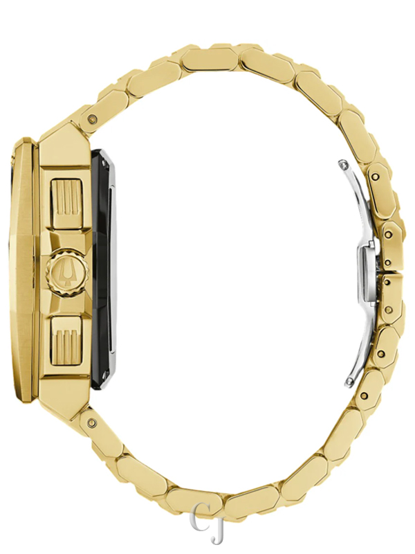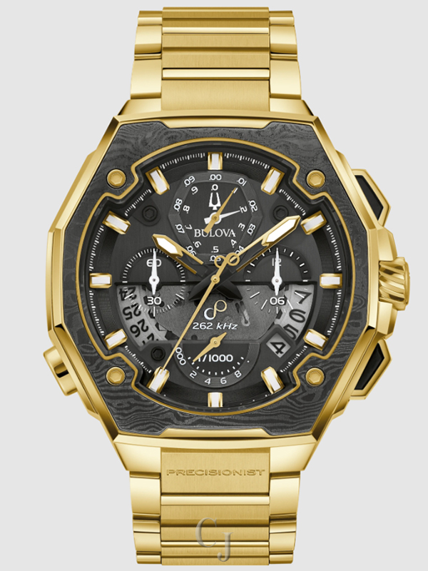 This Bulova men’s 8-hand chronograph watch brings a new dynamic to the impressive Series X collection. The modern case design features a gold-tone stainless steel faceted construction with a blend of polished and brushed finishes, with a captivating Damascus steel bezel insert. The smoky black dial features a brushed finish and a date display, with a gleaming gold-tone continuously sweeping seconds hand complemented by gold-tone hour markers with luminescent fill. The dial features a date display and chronograph subdials that allow timing to an astonishing 1/1000 second. A translucent aperture in the dial offers a peek at the Bulova proprietary high precision quartz Precisionist movement, a revolutionary 8-jewel quartz mechanism that can measure elapsed time from 1/1000 of a second to 12 hours and is accurate to seconds per year and resistant to temperature changes. The watch is paired perfectly with a dual-finish, angular gold-tone stainless steel bracelet with a push-button deployant clasp. This Bulova Series X is as reliable as it is stylish, the perfect timepiece for expressing yourself.