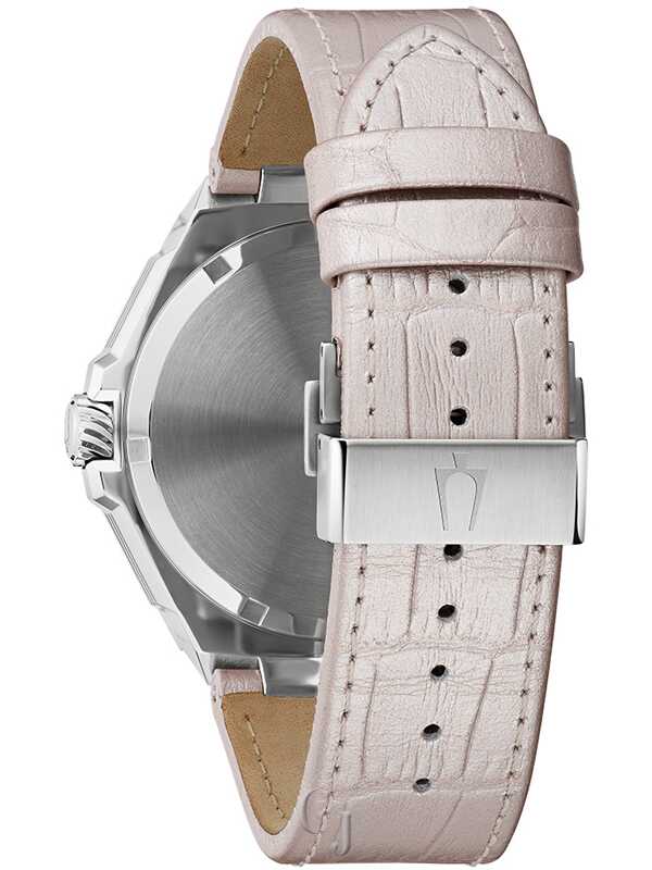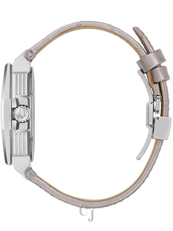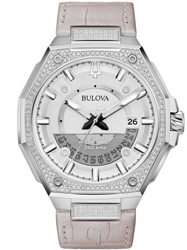 Defined by refinement and driven by innovation, this Series X timepiece balances Bulova’s most advanced technology with luxurious design. The bold case design features silver-tone stainless steel and faceted construction. with a blend of polished and brushed finishes a curved sapphire crystal with anti-reflective coating. and a bezel and strap attachment adorned with 174 dazzling hand-set 1mm diamonds totaling .83 ctw. The vibrant dial features a brushed silver-tone finish with silver-tone hands and applied markers with luminescent fill. a date window. and a seconds hand with a smooth sweep. A translucent aperture in the dial offers a peek behind the curtain at the Bulova Precisionist movement. a revolutionary 8-jewel quartz mechanism accurate to 5 seconds per month and with increased resistance to temperature changes. The watch features 100m water resistance and is perfectly paired with a white crocodile grain leather strap featuring a push-button deplovant clasp. At once elegant and versatile, this Bulova timepiece will be a favorite in any wardrobe.