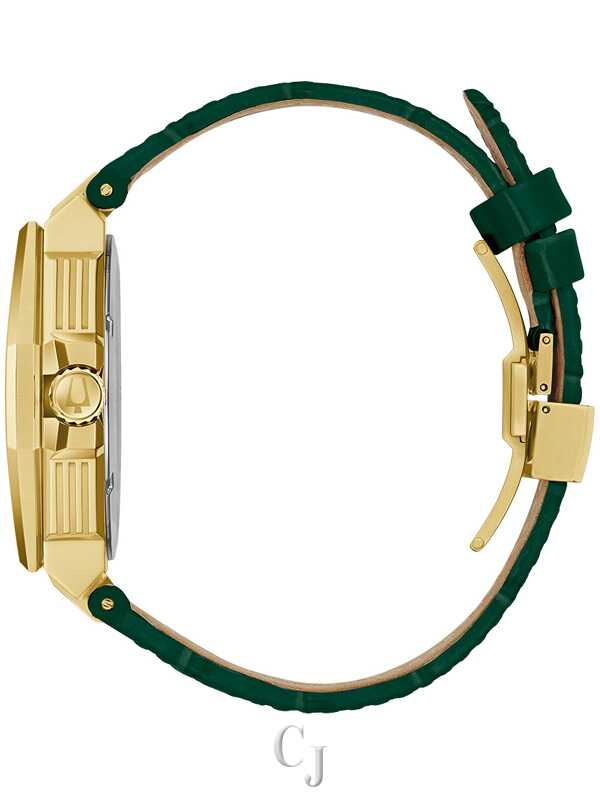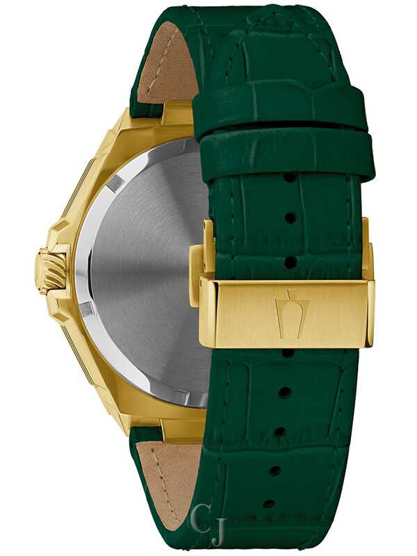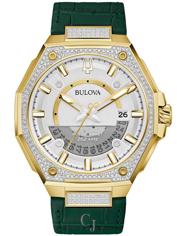 Defined by refinement and driven by innovation. this Series X timepiece balances Bulova’s most advanced technology with trulv luxurious design. The distinctive case design features gold-tone stainless steel and faceted construction, with a blend of polished and brushed finishes, a curved sapphire crystal with anti-reflective coating, and a bezel and strap attachment adorned with 174 hand-set Imm diamonds totaling .83 ctw. The striking dial features a brushed silver-tone finish with gold-tone hands and applied markers with luminescent fill, a date window, and a seconds hand with a smooth sweep. A translucent aperture in the dial offers a peek behind the curtain at the Bulova Precisionist movement. a revolutionary 8-iewel quartz mechanism accurate to 5 seconds ber month and with increased resistance to temperature changes. The watch has 100m water resistance and is paired with a bold crocodile grain leather strap in a deep green with a push-button deplovant clasp. An instant classic this Bulova timepiece provides a distinquished elegance in everv settina.