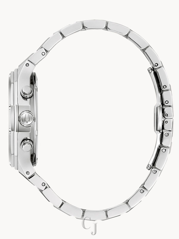 Bold, modern design characterizes this 6-hand chronograph from the Classic Bulova Prestige men’s collection. The watch features a geometric 40mm silver-tone stainless steel case with a flat sapphire crystal with anti-reflective coating, 100m of water resistance, and a chamfered 3-link bracelet with a combination of brushed and polished finishes and a push-button deployant closure. The elegantly striped gray dial has silver-tone hands and applied markers with Super-LumiNova luminescent fill, a date display, and silver-tone sub-dials including a 24-hour display. Highly functional with a distinctive design, this timepiece is suited for any occasion, from the everyday to the extraordinary.