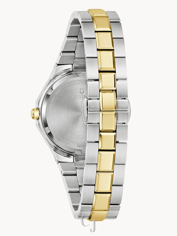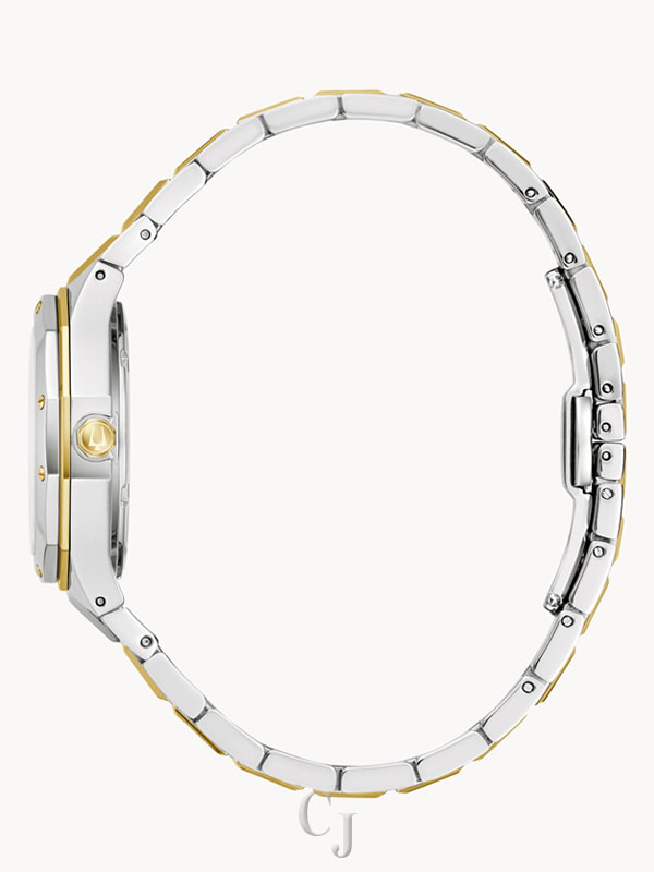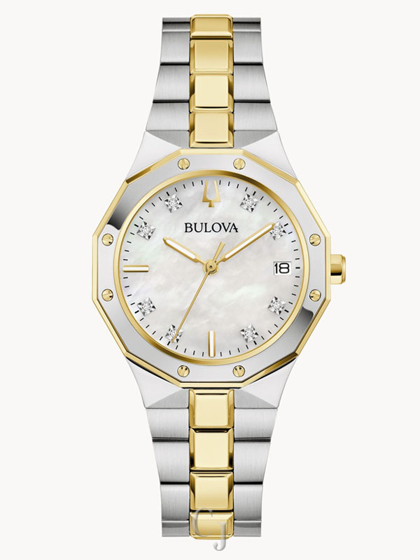 Bold, elevated design characterizes this Classic Bulova Prestige women’s timepiece that balances bold design with an elegant presence. The watch features a faceted 32mm gold- and silver-tone stainless steel case with a geometric bezel, flat sapphire crystal with anti-reflective coating, 100m of water resistance, and a chamfered 3-link bracelet with brushed and polished finishes and a push-button deployant closure. The lustrous mother-of-pearl dial has gold-tone hands and applied markers with Super-LumiNova luminescent fill, 8 dazzling diamonds, and a date display. Striking in both its modernity and its sophistication, this Bulova ladies’ watch is an ideal companion on any wrist.