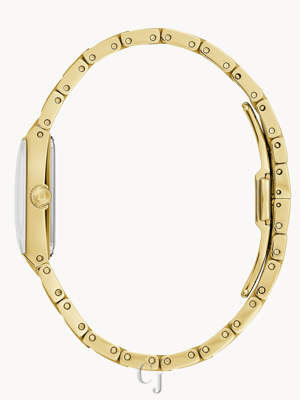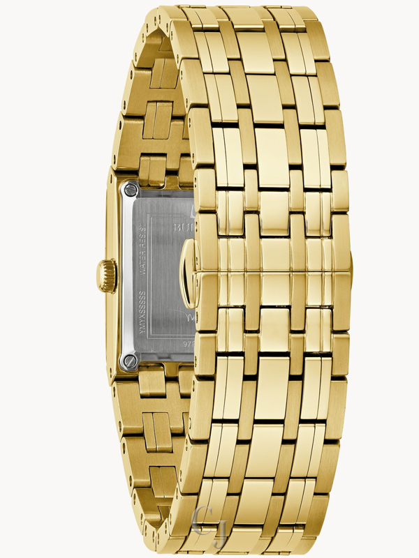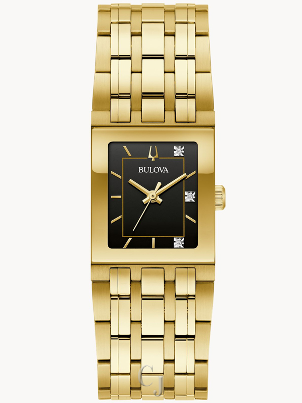 In collaboration with legendary performer Marc Anthony, this new tank style Bulova ladies’ Quadra timepiece combines the romance of his artistry with Bulova’s classically sophisticated design. The gold-tone stainless steel case recalls iconic timepiece design, while the deep black dial is accented with gold-tone hands and markers. Radiant diamonds are set at 1, 3, and 5 o’clock, chosen by Marc for their personal significance and the case back is engraved with Anthony’s signature. An intricate multilink bracelet creates a seamless silhouette with the case, with a push-button deployant closure for exceptional fit and comfort. For elegant refinement with a twist, the ladies’ Bulova Quadra timepiece created in partnership with Marc Anthony is the perfect addition to every wardrobe.