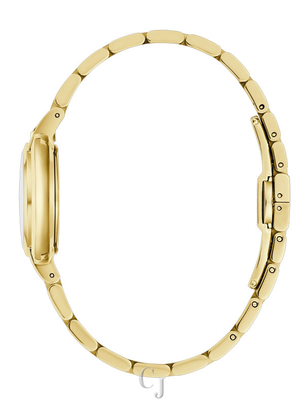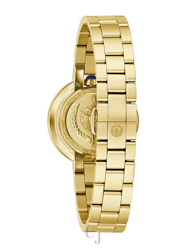 Capturing the uncompromising elegance of the iconic Rubaiyat collection, this Bulova women’s timepiece makes a bold statement with its unique case and distinctive dial. Fully polished, the oval gold -and silver-tone stainless steel case is accented by sweeping bands that extend from end to end, adding a dynamic presence on the wrist. The gold-tone crown, positioned at 12 o’clock, is set with a blue synthetic spinel cabochon, while the sapphire crystal ensures optimum legibility. The elegant silver-white dial is appointed with a balance of polished gold-tone applied Roman numeral and baton hour markers and matching hands. It features a striking guilloche texture in a concentric rose motif for a mesmerizing appearance. Completing the ensemble is a matching 3-link two-tone stainless steel bracelet with an effortless push-button deployant closure. Stand out in style with this Bulova ladies’ Rubaiyat timepiece.