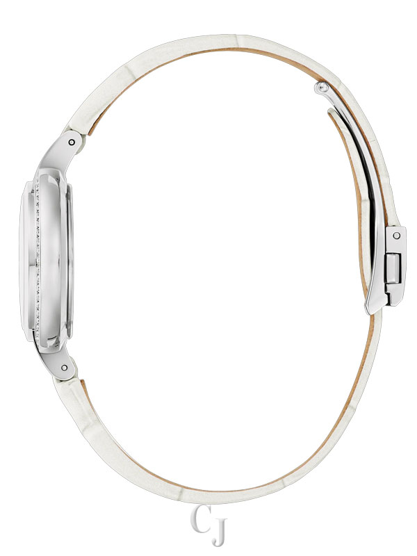 The Rubaiyat “Winter” shines with 42 white sapphires, totaling .25 ctw, evoking an icy winter landscape encircling its silver-tone stainless steel petite 30mm halo case and synthetic spinel cabochon crown. The mosaic dial, crafted from lustrous white mother-of-pearl, shimmers like freshly fallen snow, with an iridescent quality that makes each dial unique, accented by icicle-shaped faceted markers and finished with a double curved sapphire crystal. Paired with a glossy white alligator grain strap with a custom fold over strap with two pushers, this luxurious women’s timepiece adds elegance to any occasion and comes in special Rubaiyat packaging, complete with a storybook.