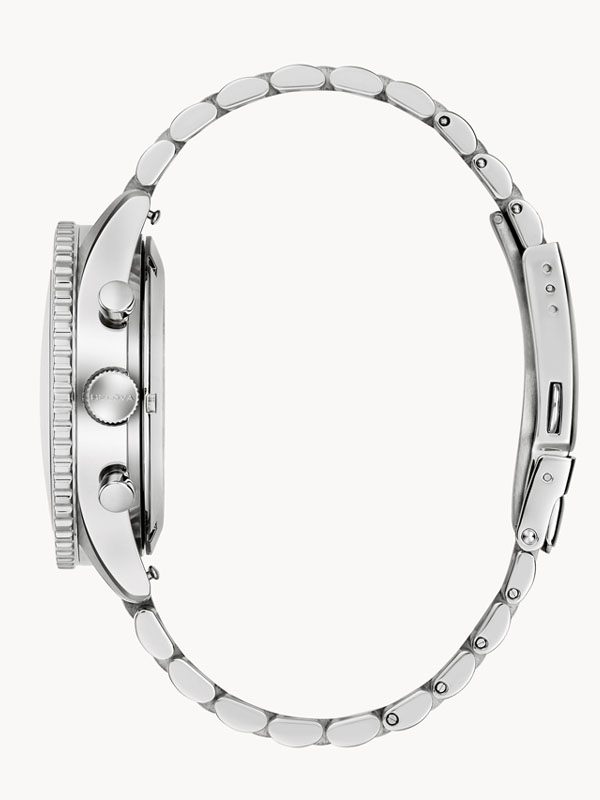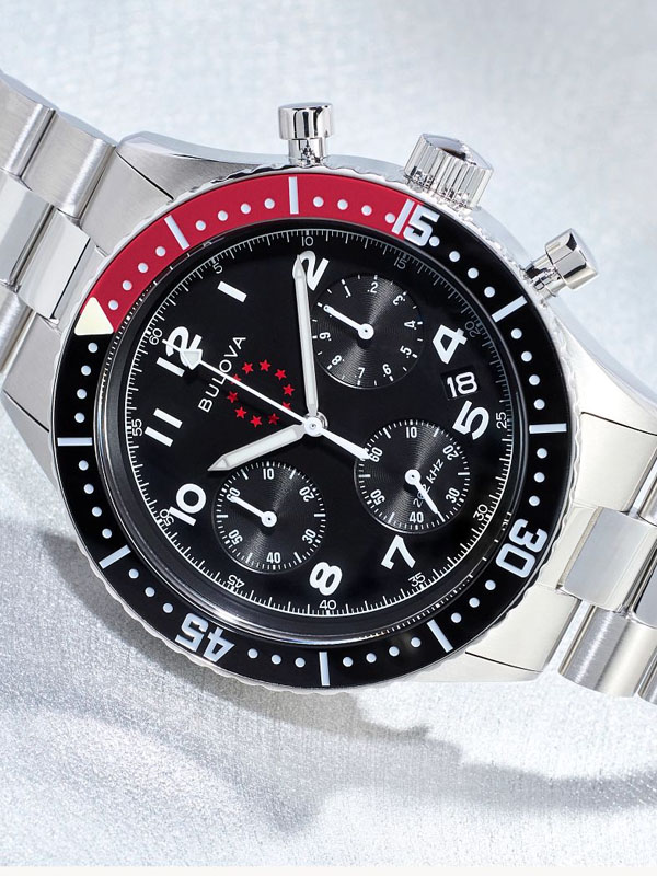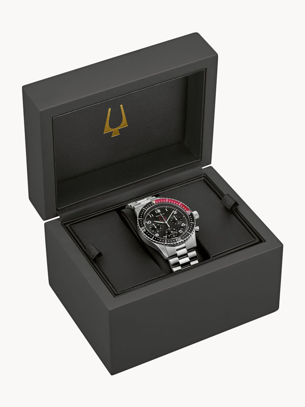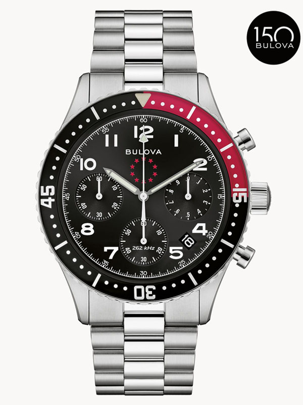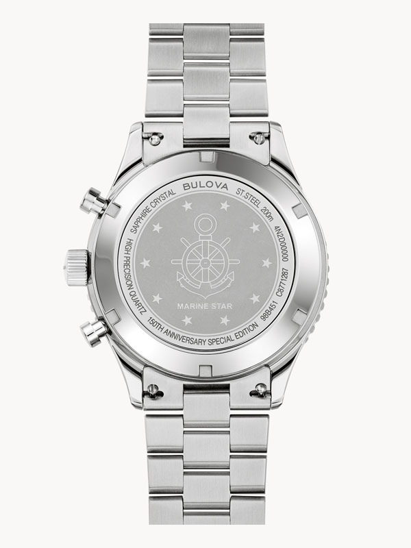 Inspired by the coveted Bulova’s Marine Star circa 1970s, this Special Edition Marine Star 6-hand chronograph celebrates one of Bulova’s most iconic collections for its 150th Anniversary. The silver-tone stainless steel case has a design that balances form and function with a striking ratcheting timing bezel, a commemorative case back featuring an original anchor design, and a profile-cut link bracelet with a push-button foldover closure. The black dial showcases the vintage Marine Star logo, silver-tone hands, and white numerals with super luminous fill, a date display, and sub-dials, including registers allowing timing to 1/20 of a second and finished with a double domed sapphire crystal. This collector’s watch is powered by our proprietary Precisionist movement, resonating at a frequency of 262khz for unparalleled accuracy, and boasts 200m water resistance with a screw-down crown. Delivered in premium packaging complete with a storybook, this Bulova men’s timepiece blends classic maritime charm with modern craftsmanship and a rich history.