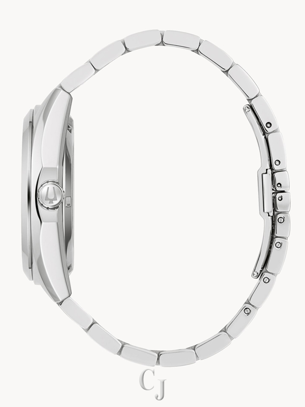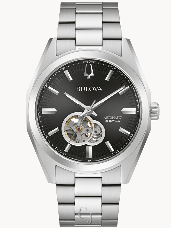 Part of the Surveyor line of Bulova watches, this updated classic automatic watch offers all of the detail and fine quality you would expect in a luxury watch, at an accessible price. The silver-tone stainless steel case and bracelet is paired with a rich black dial with silver-tone accents and an open aperture to view the movement’s balance wheel and escapement. The screw-back case is topped with a mineral crystal exhibition window to showcase the automatic movement powering the timepiece. This beautifully detailed, quality timepiece is destined to become a new favorite in any collection.
