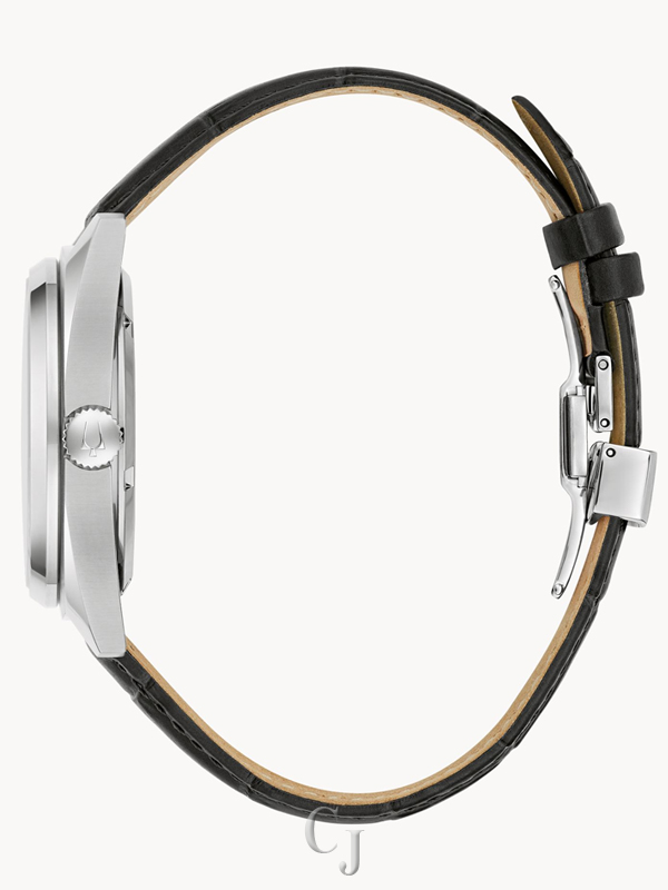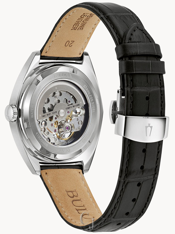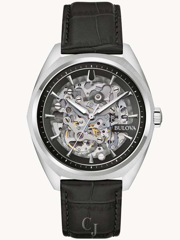 This new men’s automatic timepiece from the Bulova Surveyor collection offers modern style and luxurious craftmanship at an exceptional price. The contemporary silver-tone stainless steel case conveys an eye-catching blend of brushed and polished surfaces with a subtle angularity and a domed mineral crystal. The remarkable dial is highlighted by the display of the skeletonized automatic 21-jewel movement, which features a 42-hour power reserve. Surrounding the dial is a black chapter ring with applied hour indices, which is complemented by angular hands with luminescent fill. The watch is paired with a refined black leather strap with a 3-piece closure for an ideal fit. With a striking dial and captivating design, this watch is the perfect timepiece for everyday style.