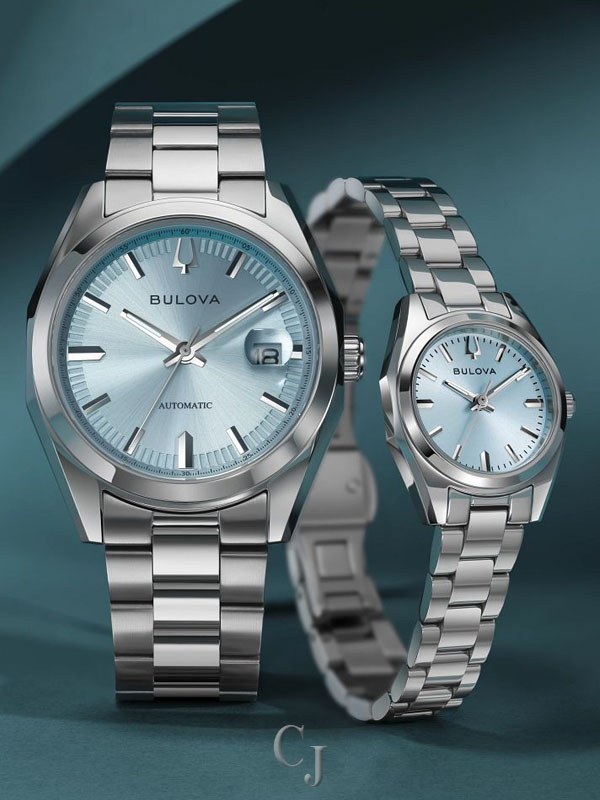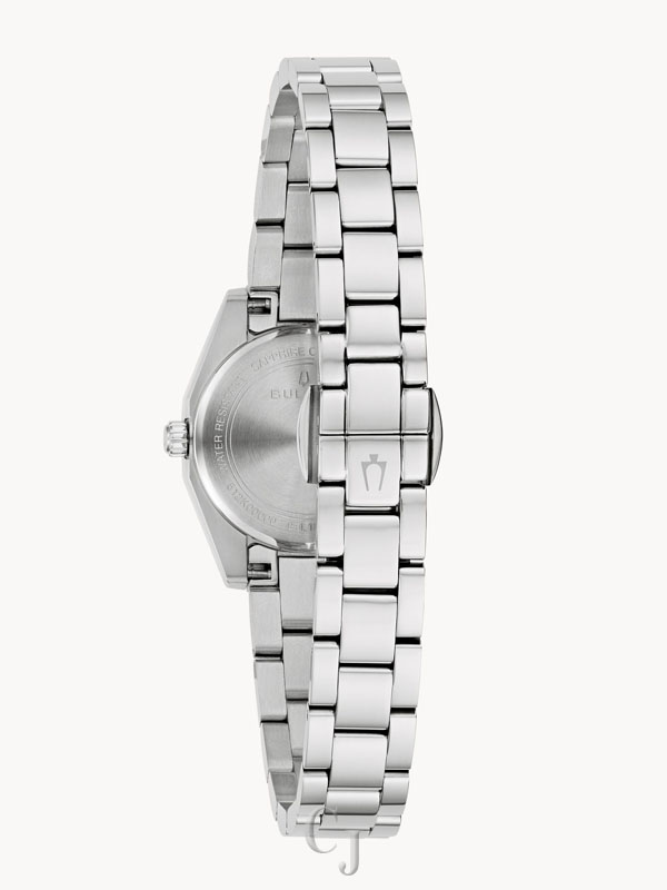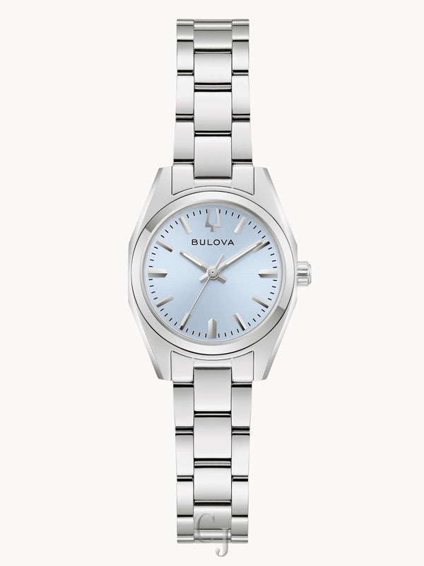 Defined by exceptional quality and sophisticated aesthetics, the Bulova ladies’ Surveyor is the quintessential modern timepiece updated with a mini 23mm case. Sculpted edges and faceting distinguish the polished silver-tone stainless steel case, with polished and brushed finishing, a flat sapphire crystal, and a matching 3-link silver-tone stainless steel bracelet with a push-button deployant clasp and easy-release latched spring bars. The radiant light blue dial has a sunburst finish and silver-tone accents and hands with luminescent fill. For those with a discerning eye for refined luxury, this Bulova women’s timepiece is the perfect everyday companion.