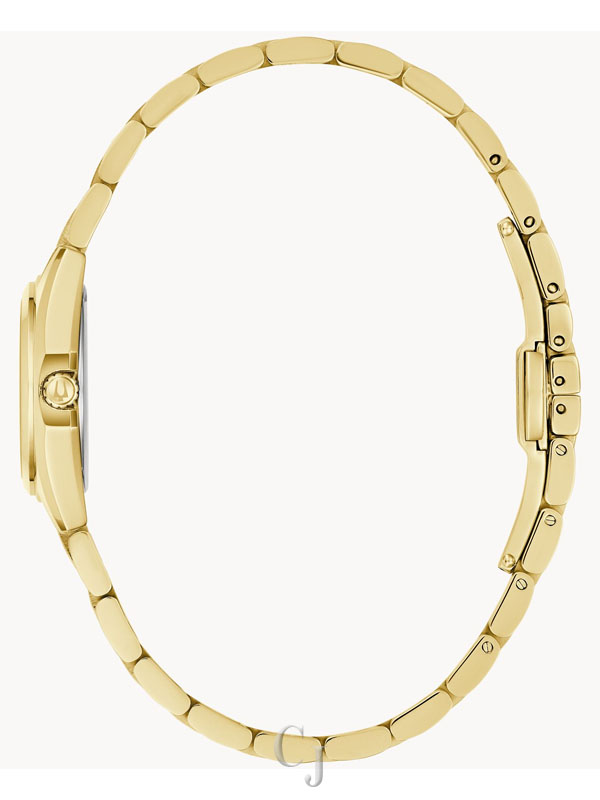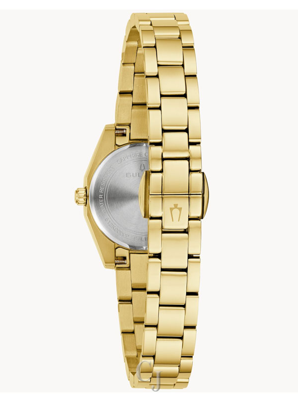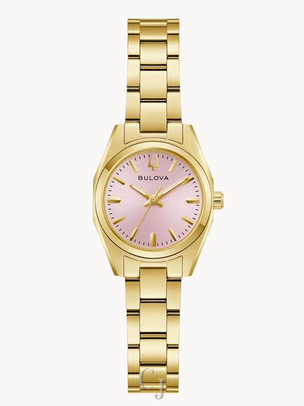 Defined by exceptional quality and sophisticated aesthetics, the Bulova ladies’ Surveyor is the quintessential modern timepiece updated with a mini 23mm case. Sculpted edges and faceting distinguish the gold-tone stainless steel case, with polished and brushed finishing, a flat sapphire crystal, and a matching 3-link gold-tone stainless steel bracelet with a push-button deployant clasp and easy-release latched spring bars. The radiant pink dial has a sunburst finish and gold-tone accents and hands with luminescent fill. For those with a discerning eye for refined luxury, this Bulova women’s timepiece is the perfect everyday companion.
