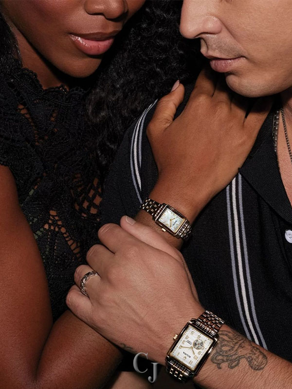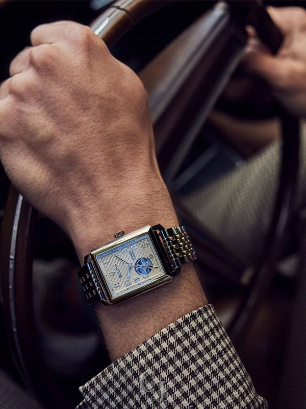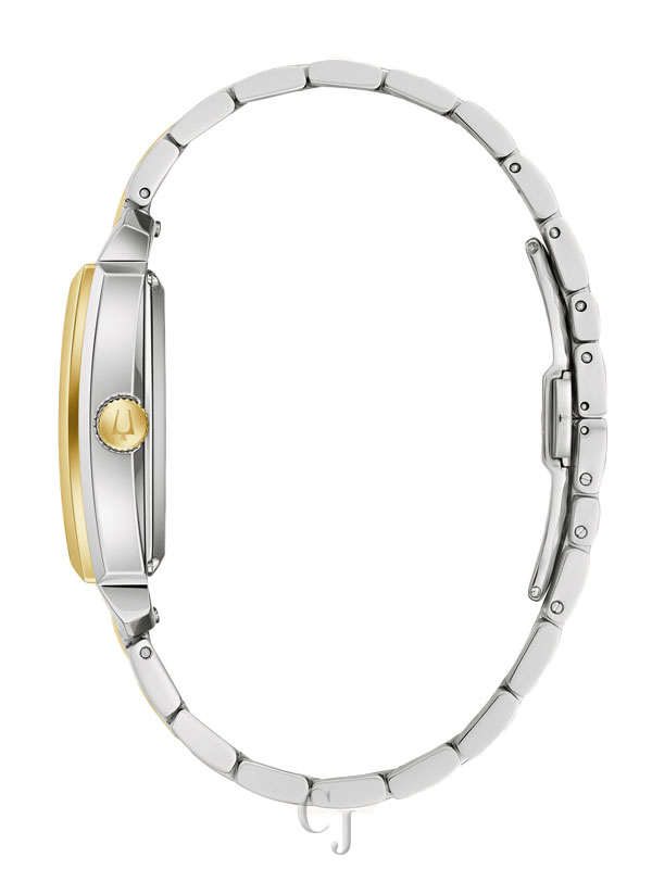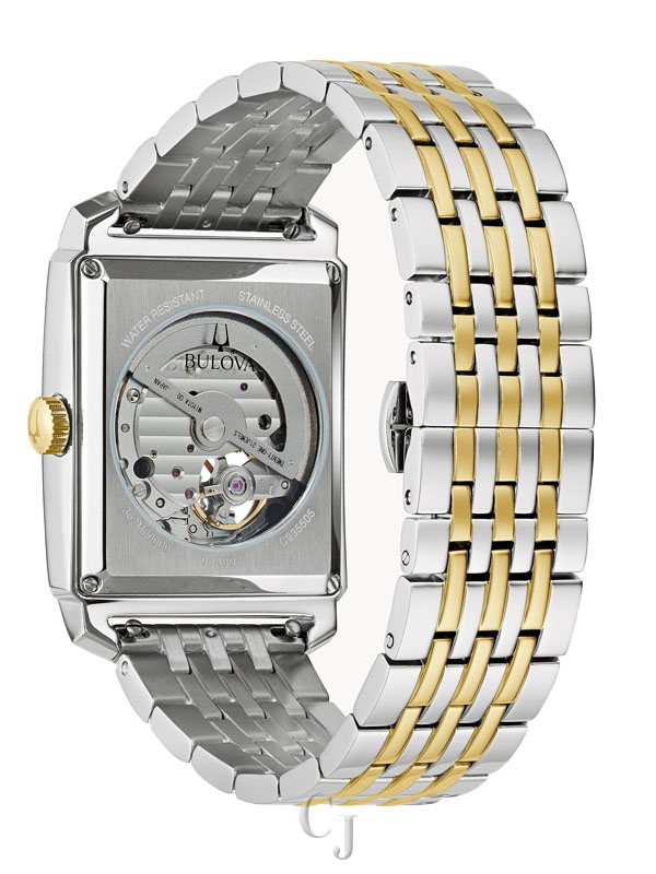 From the Sutton Collection, this new men’s Bulova timepiece delivers sophisticated style with a mechanical heart. The refined rectangular two-tone stainless steel case features a silver-tone body and a gold-tone frame around a curved mineral crystal. A textured silver white dial is appointed with gold-tone Arabic numerals with matching hands. At 7 o’clock, a framed aperture offers a view of the beating heart of the watch, the 21-jewel mechanical movement which has a power reserve of 42 hours. A matching five-link bracelet features a deployant closure with pushers for a seamless fit. Richly embellished and exquisitely designed, this new Bulova men’s timepiece is a smart companion for the stylish gentleman.