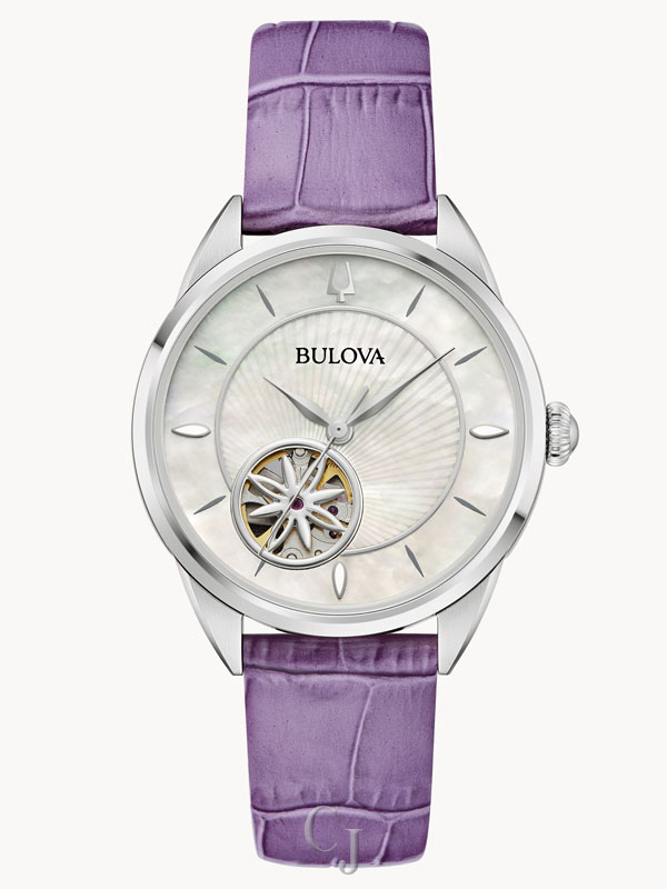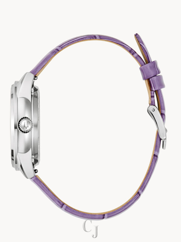 Unparalleled in refinement and timeless in design, this Bulova women’s timepiece introduces a new automatic watch from the Sutton Collection that will elevate your style. The watch features a 34mm silver-tone case with a domed sapphire crystal with anti-reflective coating and is paired with a lavender color croc-textured leather strap. The lustrous mother-of-pearl dial features a sunray pattern, silver-tone hour markers and hands, and a floral aperture revealing the heart of the 21-jewel automatic movement, also visible through a transparent case back, which has a power reserve of 42 hours. This Bulova ladies’ watch is made for those with an eye for style who want to make a statement.