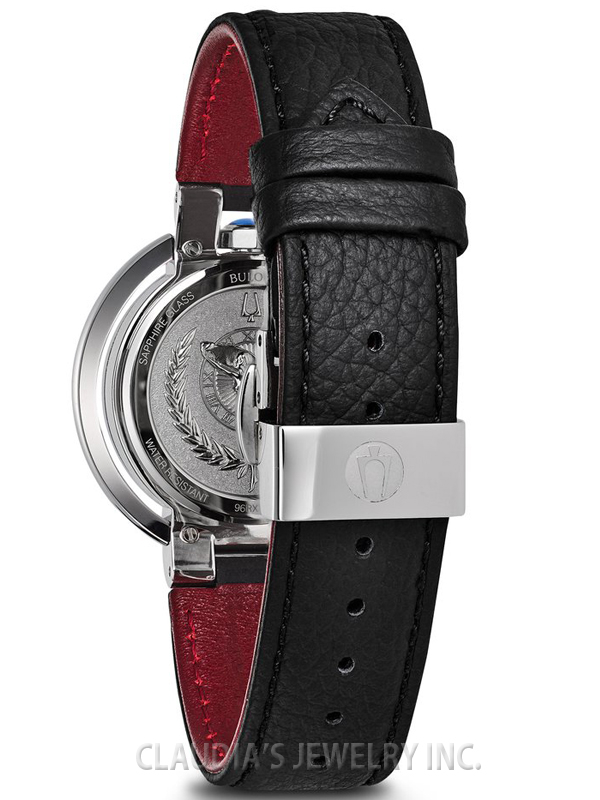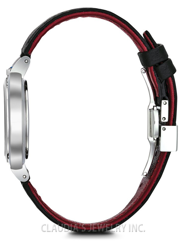 From the Rubaiyat Collection. Legendary heritage reinvented in stainless steel case with synthetic blue spinel cabochon crown at 12 o’clock position and 36 diamonds individually hand set on case and textured black dial, double curved sapphire crystal, black leather strap lined in merlot with double-press deployant closure, iconic dye struck “Goddess of Time” dimensional case back, and water resistance to 30 meters.