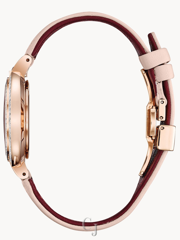 Legendary heritage reinvented in rose gold-tone stainless steel case with synthetic blue spinel cabochon crown at 12 o’clock position and 141 diamonds individually hand set on case, case parenthesis and lugs. Textured silver-white dial, double curved sapphire crystal, rose gold-tone stainless steel bracelet with double-press deployant closure, and iconic dye struck “Goddess of Time” dimensional case back.