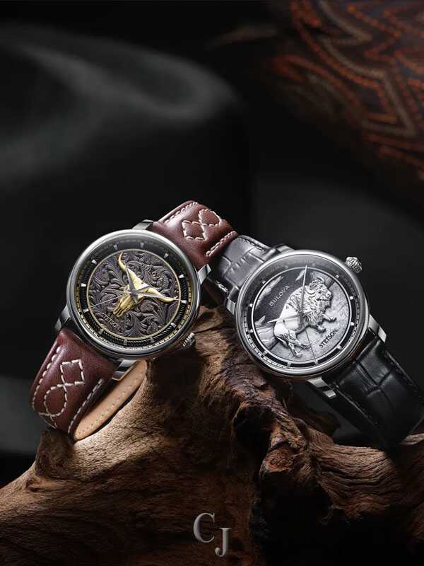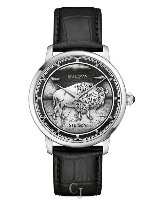 The Bulova x Stetson Bison watch brings two quintessential American brands together to create an iconic timepiece that commemorates the founding of the John B. Stetson Company in 1865 through a collaboration steeped in heritage. A stamped American Bison medallion on the dial symbolizes the enduring spirit of the West and is enhanced by black antiquing and striking silver-tone hands. Echoing Stetson’s legendary style and attention to detail, its silver-tone stainless steel case is elevated with a sapphire crystal and an onion crown with a black onyx cabochon. The automatic 21-jewel movement is visible through an open case back, which is printed with a classic Stetson hat and encircled with a laurel wreath pattern. Finished with an alligator grain black leather strap, the 160th Anniversary Bison watch is both a fitting tribute to and a continuation of the brands’ dual commitment to quality and heritage.